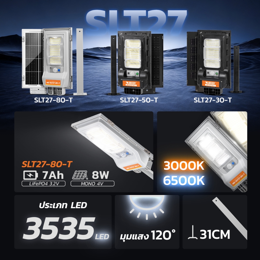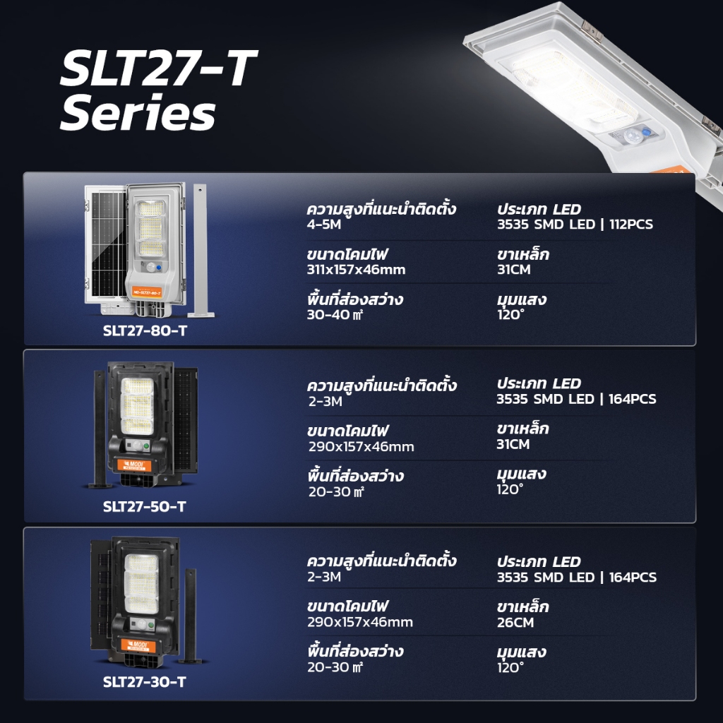 MODI ไฟถนนโซล่าเซลล์ 30T 50T 80T แสงขาว แสงเหลือง daylight warm light ขาเหล็ก ระบบสว่างค้างถึงเช้า