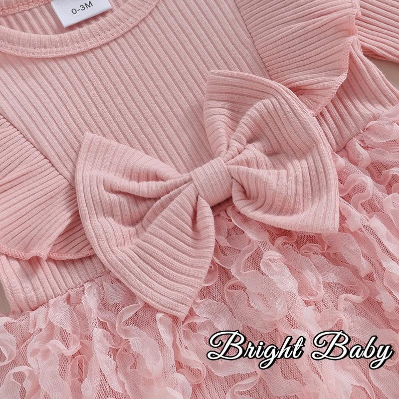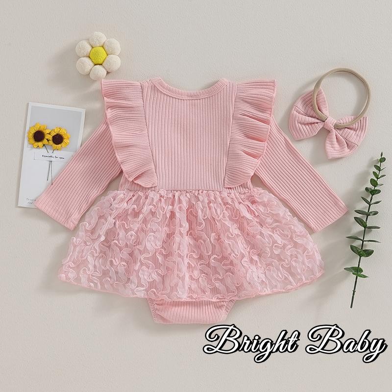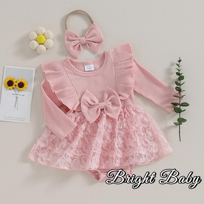เด็กทารก Rompers ชุดแขนยาว Bowknot ลูกไม้ Layered Tulle กระโปรง Hem เด็กวัยหัดเดินบอดี้สูทพร้อมแถบคาดศีรษะ
