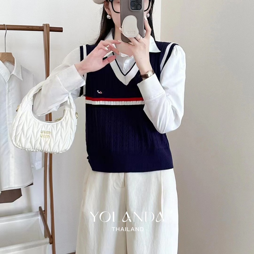 【SAT】Yolanda เสื้อไหมพรม เชิ้ตคอปกแขนยาว+กั๊กไหมพรม ผ้าเย็บติด เสื้อแฟชั่น สำหรับผู้หญิง สาวเกาหลี งานน่ารัก FF1045