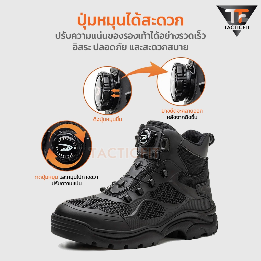 รองเท้าเซฟตี้ Tactical Boots รุ่น "TACKLE" หัวเหล็ก ปุ่มหมุนล็อค ไม่ต้องผูกเชือกรองเท้า พื้นนุ่ม ระบายอากาศดี