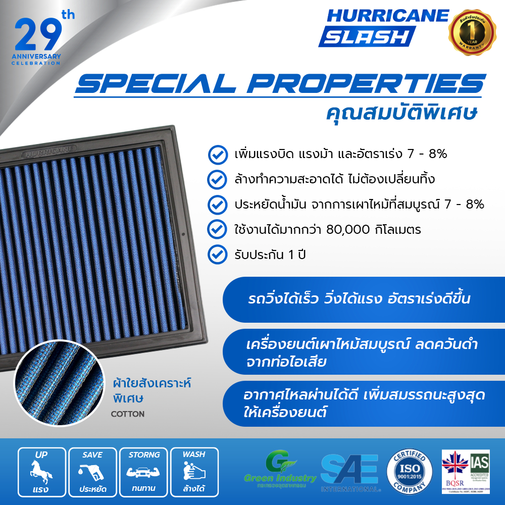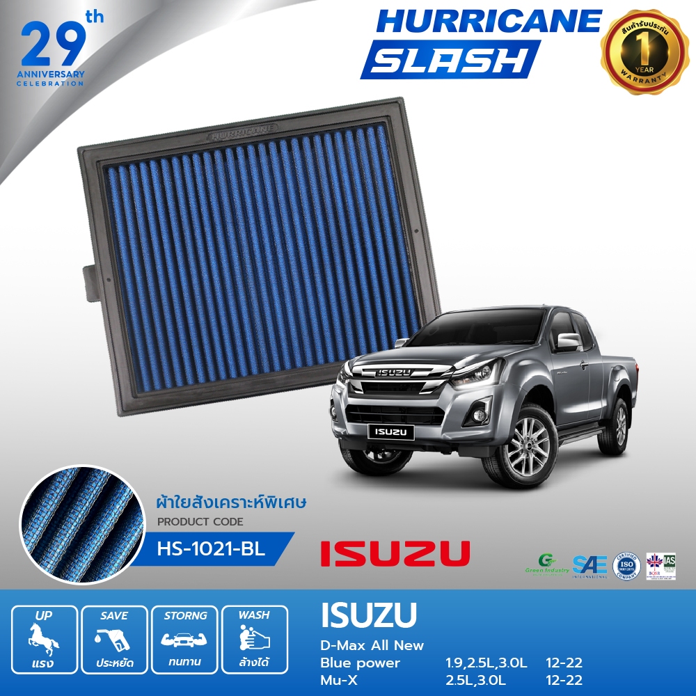 HURRICANE SLASH กรองอากาศผ้าน้ำเงินรุ่นใหม่ล่าสุด Isuzu ( D-Max All New , Mu-X ) HS-1021-BL