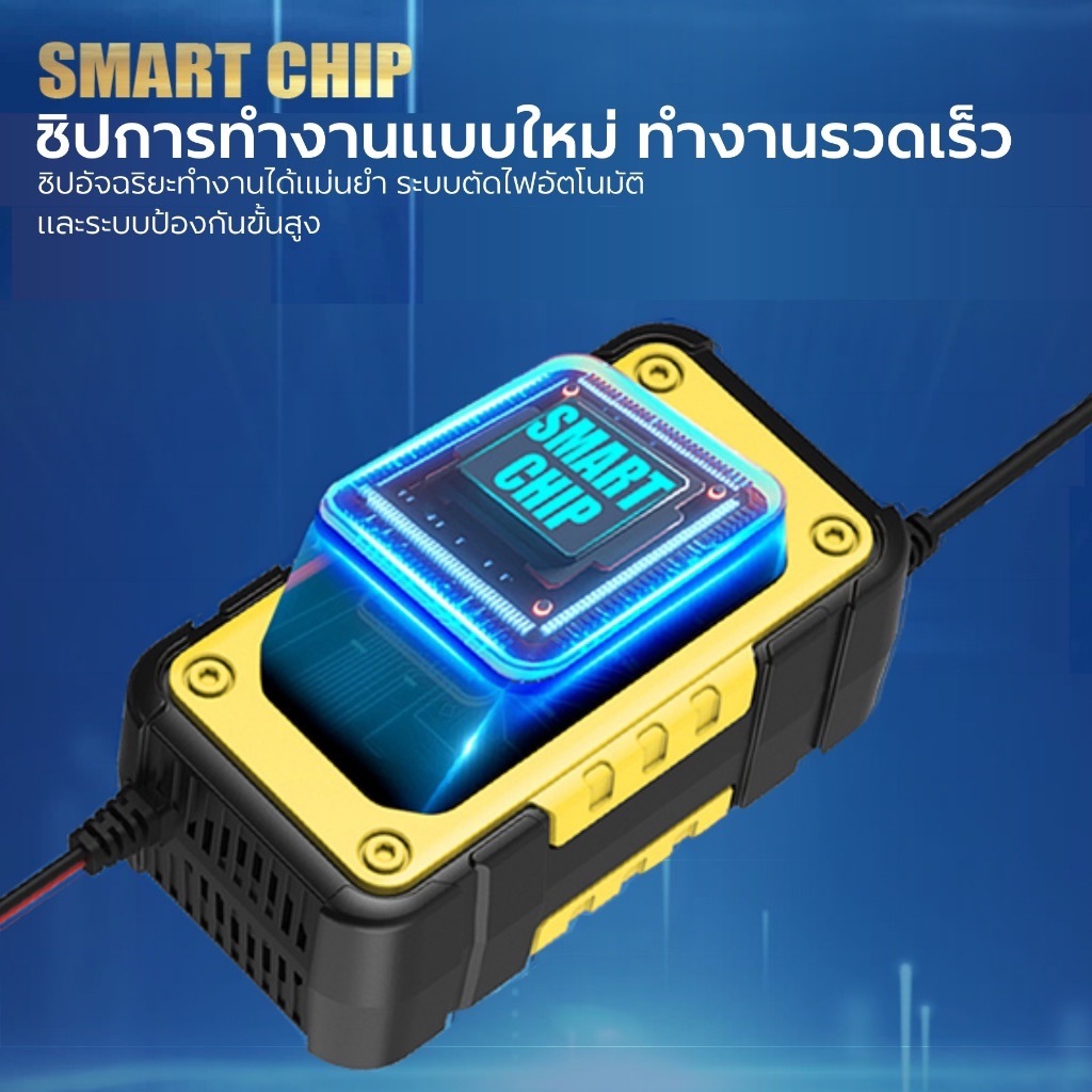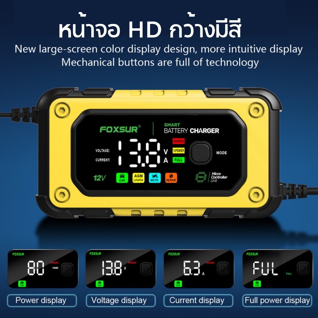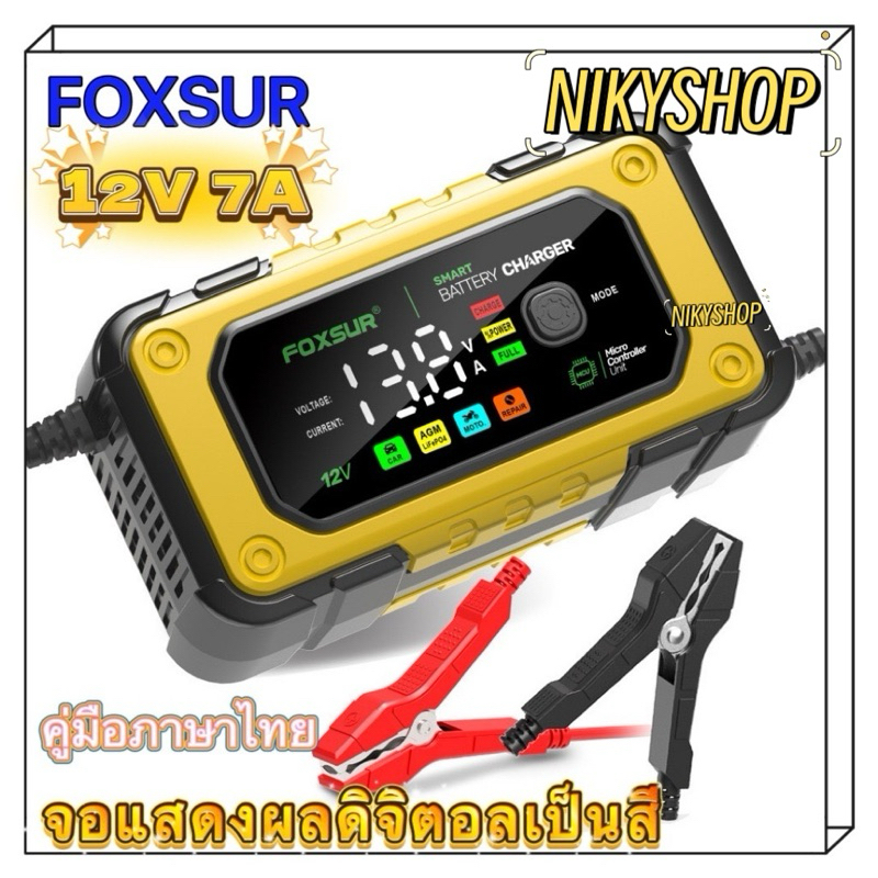 รุ่นใหม่จอการแสดงเป็นสีเครื่องชาร์จแบตเตอรี่ และฟื้นฟู FOXSUR รุ่นใหม่ล่าสุด FBC1207E สีเหลือง 12V 7A (ชาร์จแบตลิเธียมไ