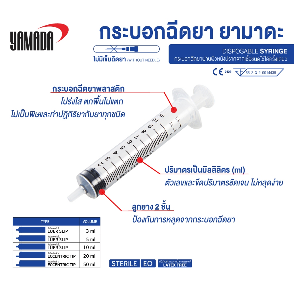 ไซริงค์ทางการแพทย์,กระบอกฉีดยา แบบใช้แล้วทิ้งไม่มีเข็ม ขนาด 3ml,5ml,10ml,20ml,50ml YAMADA