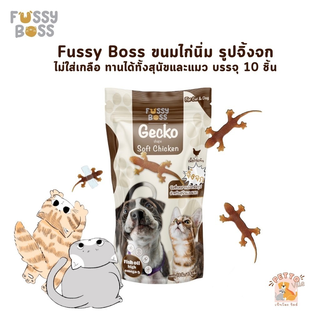 Fussy Boss ฟัสซี่บอส ขนมรูปจิ้งจก ไก่นิ่ม ไม่ใส่เกลือ ทานได้ทั้งสุนัขและแมว ขนาด 20 กรัม (10 ชิ้น)