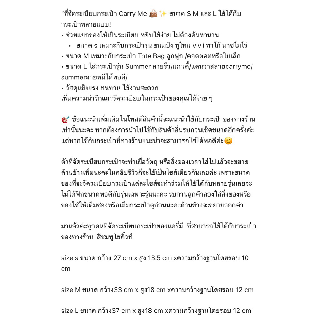 Carry Me พร้อมส่ง ที่จัดระเบียบกระเป๋า สีชมพู ใช้ได้กับกระเป๋าของร้านทรง Tote Bag/Summer Bag 💗💖