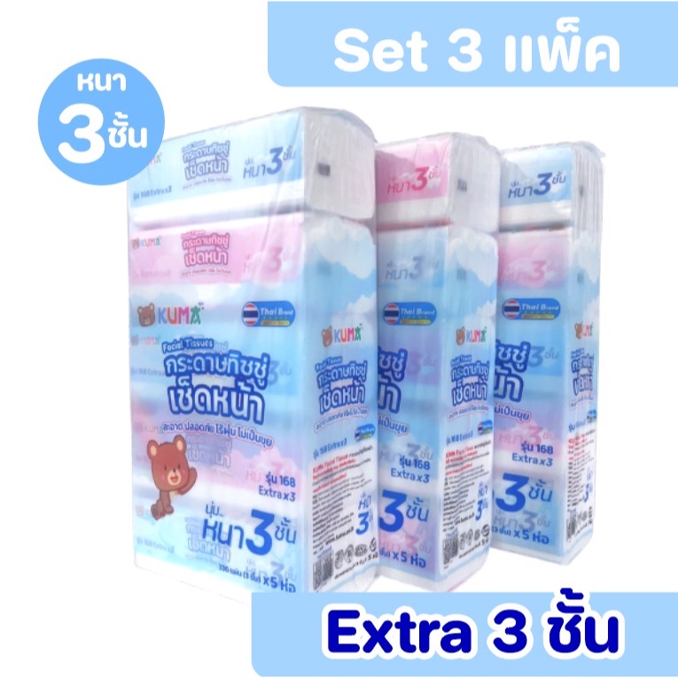 (LIVE)[เซท 3 แพค] KUMA กระดาษทิชชู่เช็ดหน้า คุมะ ห่อละ 168แผ่น หนา3ชั้น แพค 5ห่อ เช็ดหน้า