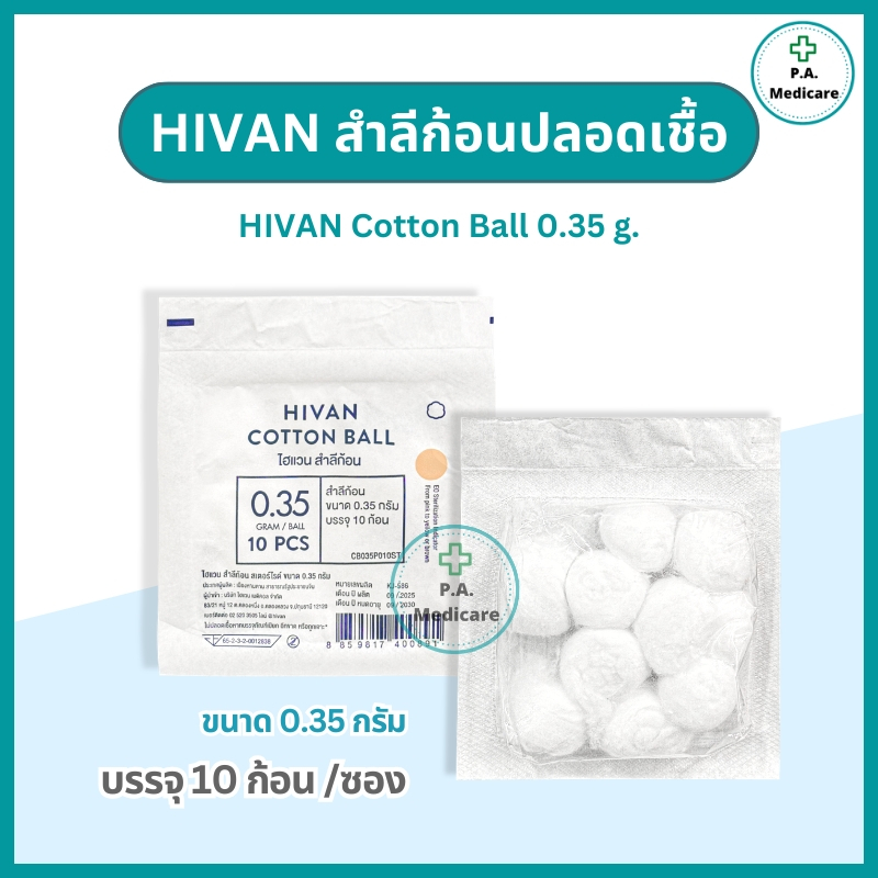 Hivan สำลีก้อนปลอดเชื้อ 10 ก้อน x 100 ซอง (0.35 กรัม/ก้อน) สำลีก้อนกลม สเตอร์ไรด์ sterile cotton ball ซองละ 10 ก้อน