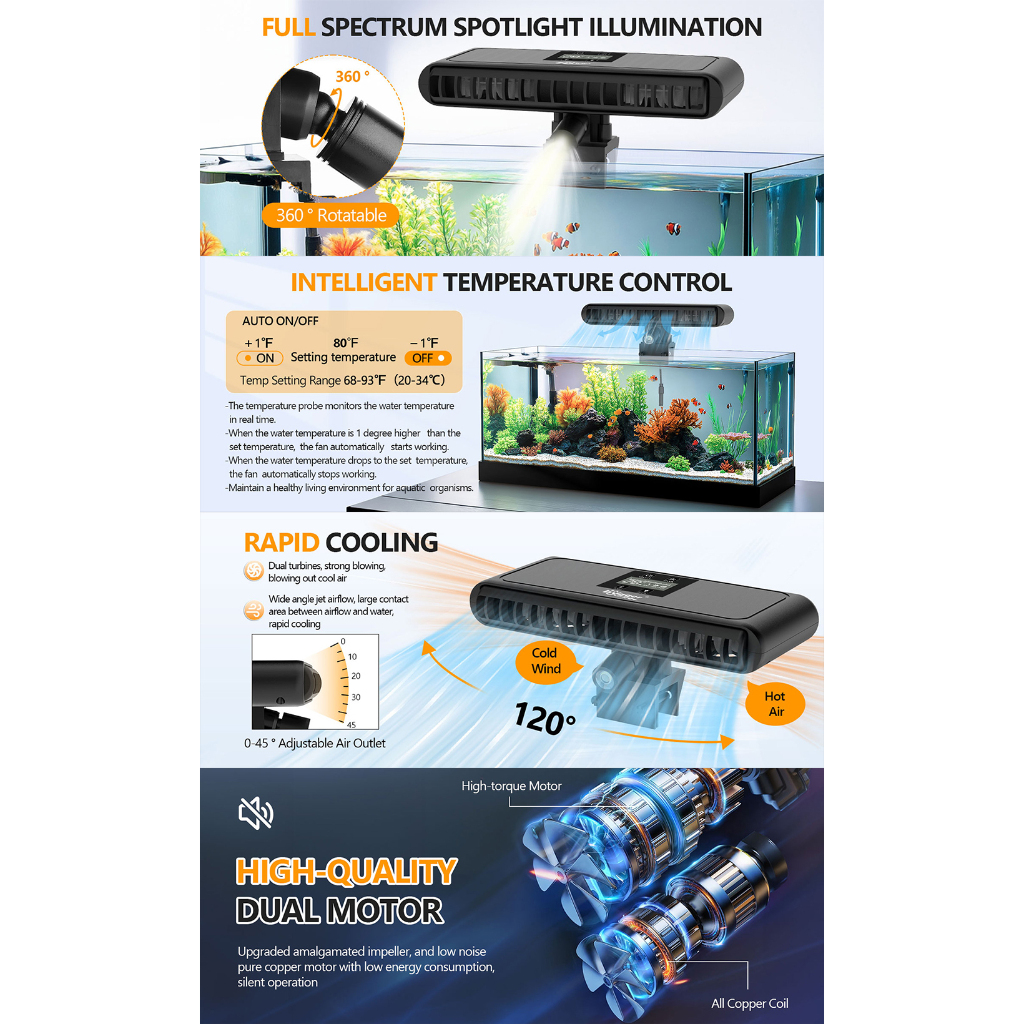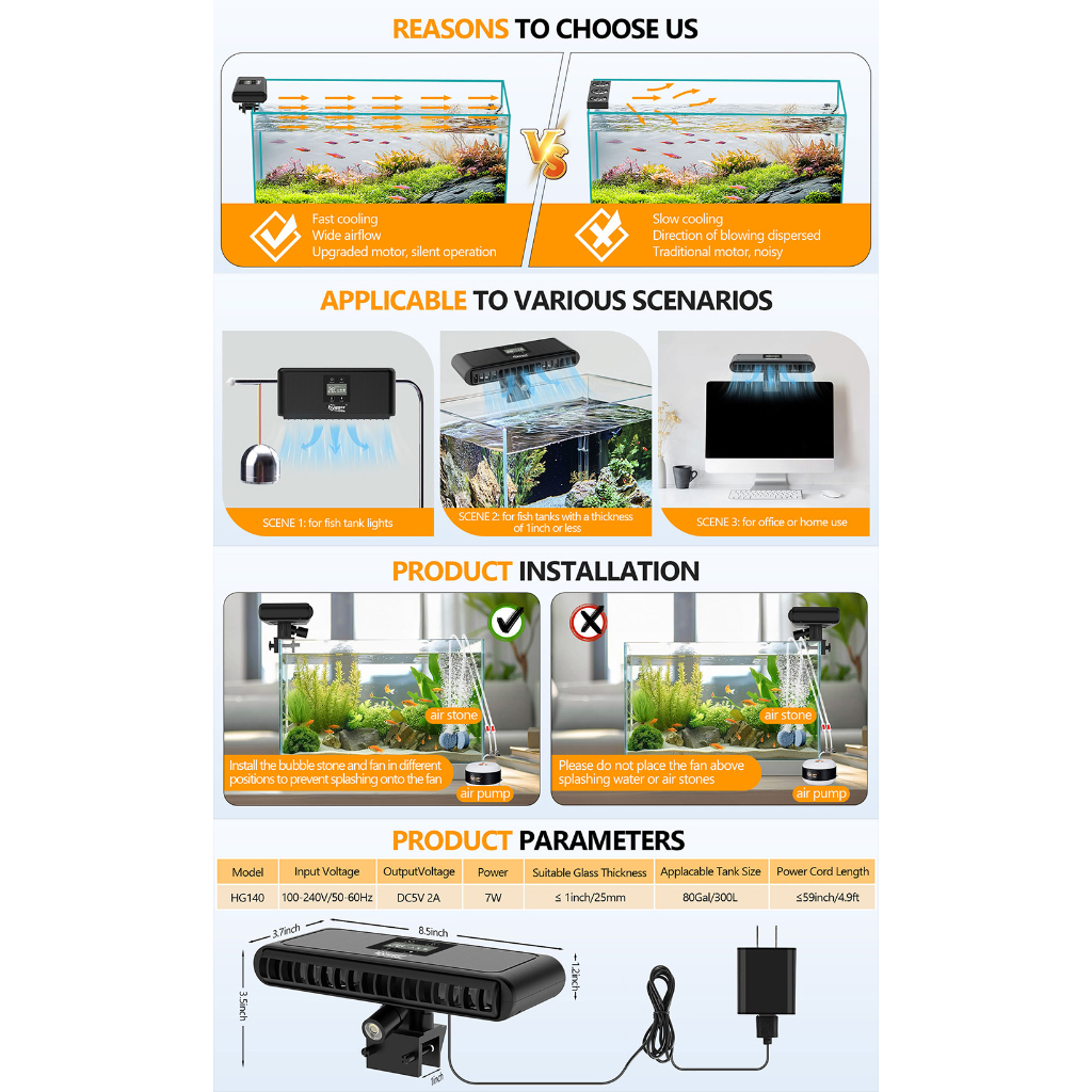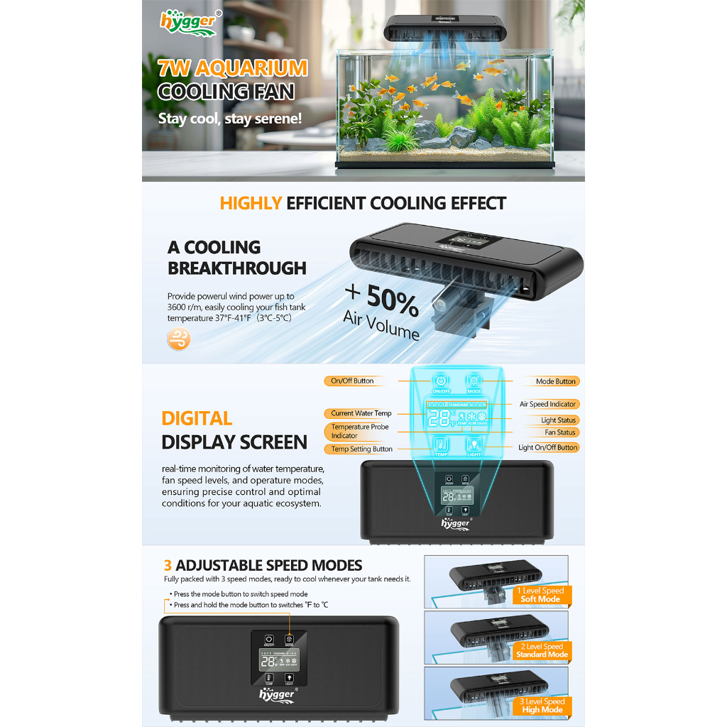 Hygger Autumn Cooling Fan HG-140 พัดลมอัตโนมัติ พัดลมตู้ปลา ลมแรง ปรับมุมยิงได้ พร้อมไฟ LED
