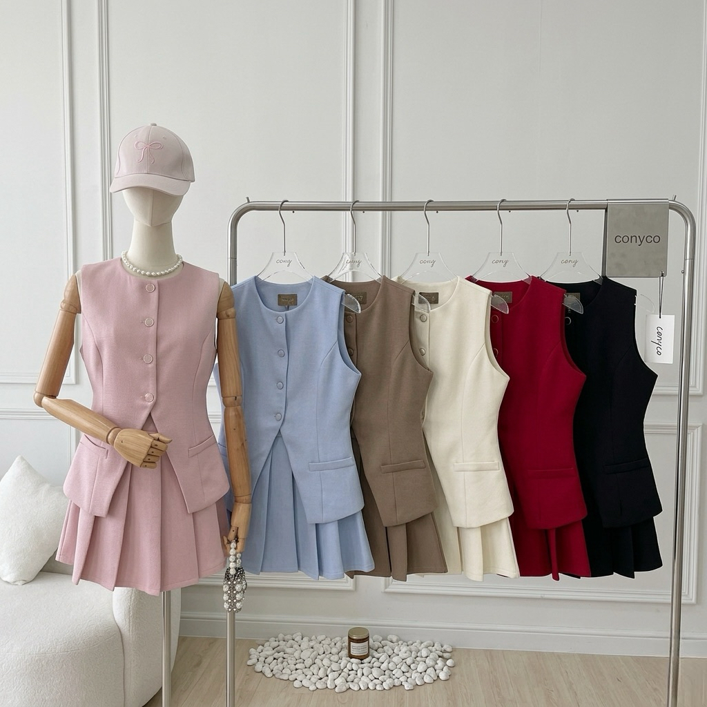 conycolours | Velina Vest Set ชุดเซตเสื้อกั๊กกระดุมหน้า กระโปรงจีบ