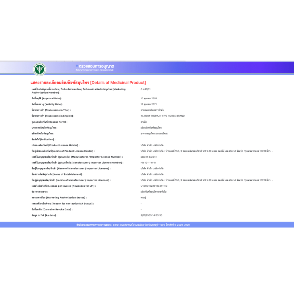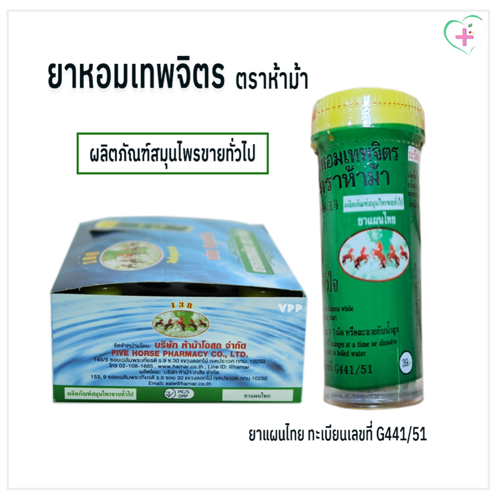 ยาหอมเทพจิตร ตราห้าม้า 3 หลอดๆ ละ 30 เม็ด ผลิตภัณฑ์สมุนไพรขายทั่วไป เลขทะเบียนที่ G441/51 ใช้อมครั้งละ 5-7 เม็ด