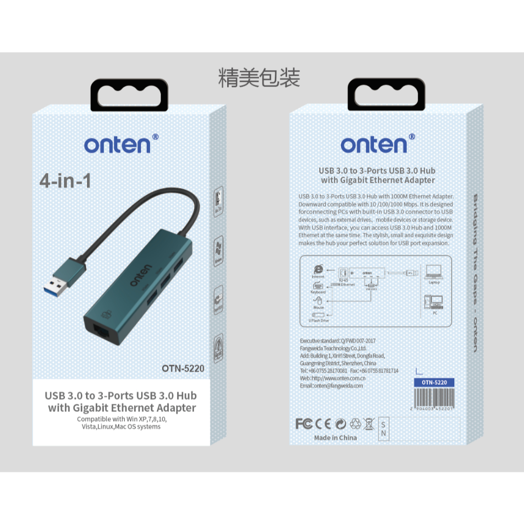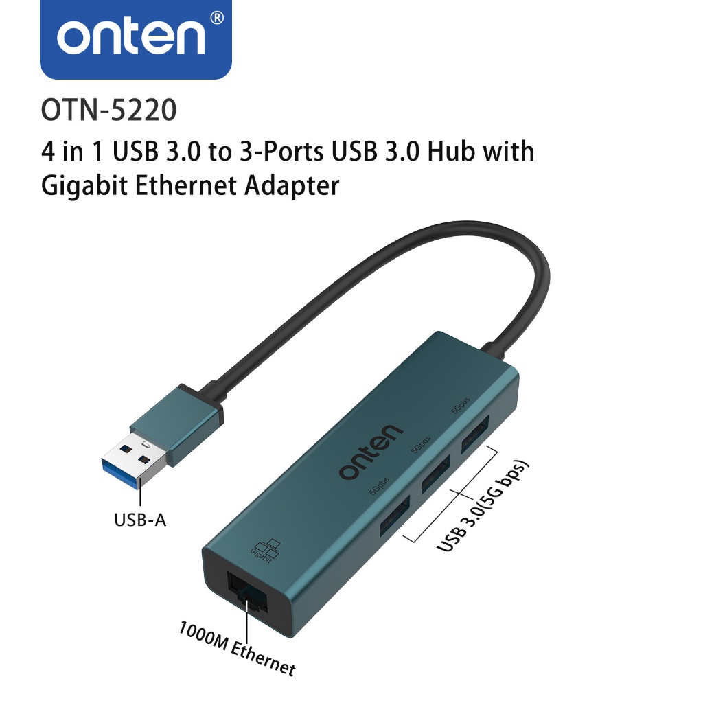 Onten OTN-5220 USB3.0 to 3-Ports USB 3.0 Hub with Gigabit Ethernet Adapter