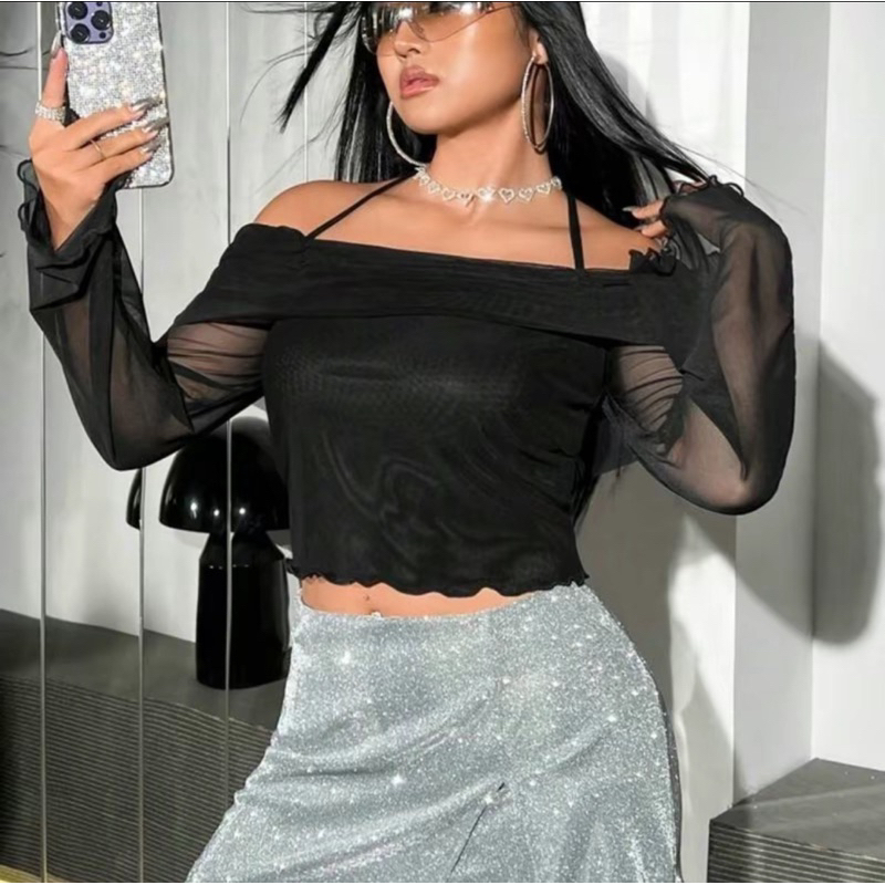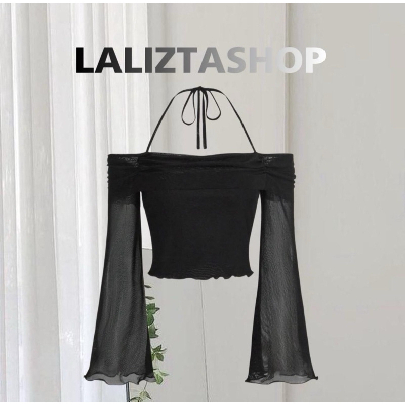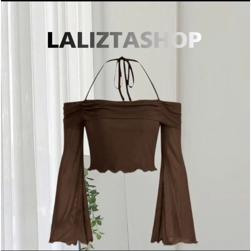 (พร้อมส่ง) PAKKAD เสื้อปาดไหล่แขนกระดิ่งมัดคอ สาวอวบ อก 34-42