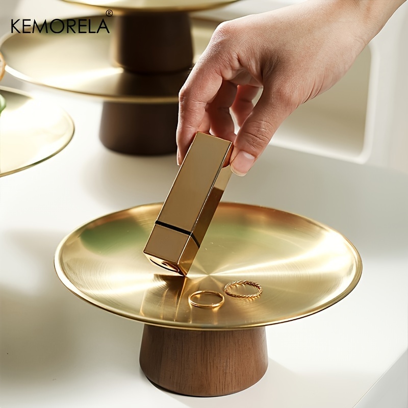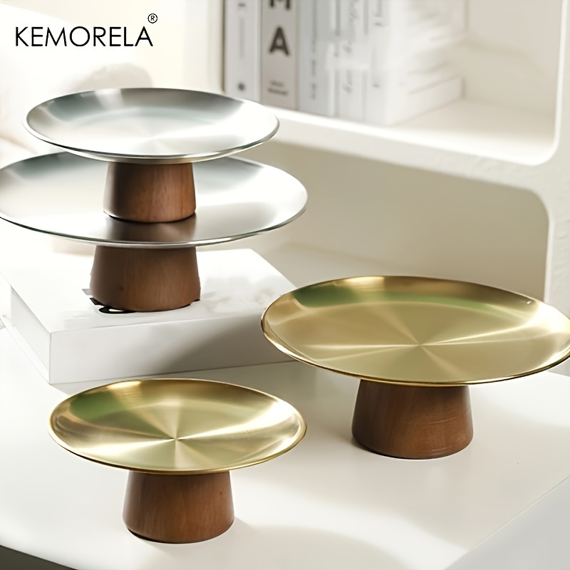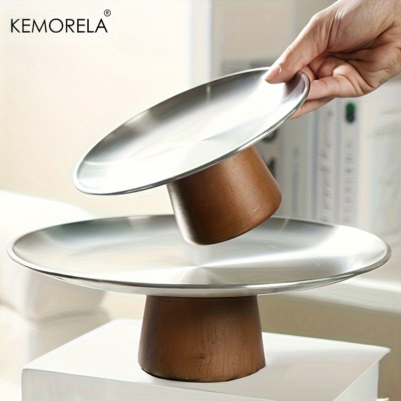 KEMORELA ถาดสเตนเลส ทรงสูง ฐานไม้เนื้อแข็ง สําหรับใส่ขนมเค้ก ผลไม้ ลิปสติก น้ําหอม เหมาะกับร้านอาหาร และบ้าน