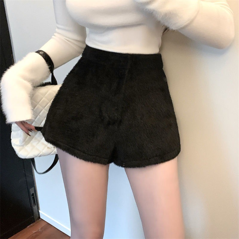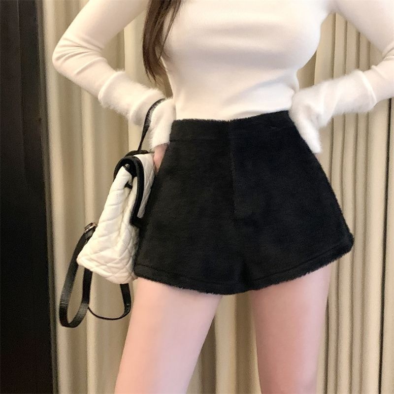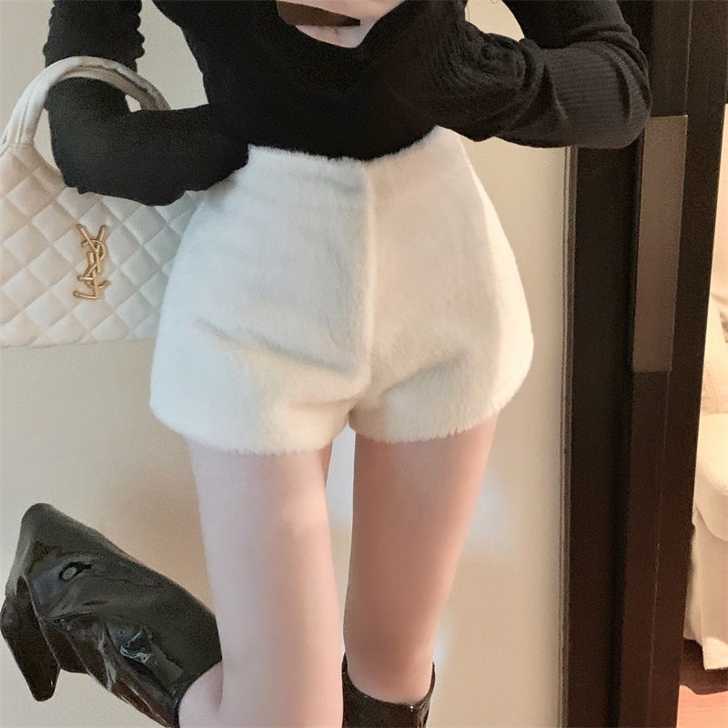 [เห็ด] กางเกงเลกกิ้งขาสั้น เอวสูง ทรงเอ ผ้ากํามะหยี่ขนนิ่ม ลําลอง สีขาว แฟชั่นฤดูหนาว สําหรับผู้หญิง 2024