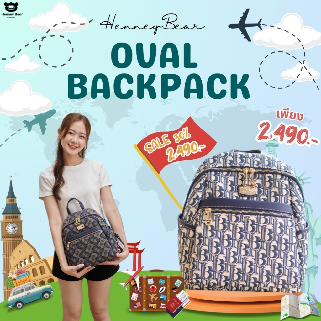 Henneybear-H1172 รุ่น Oval back - ลาย HB bear กระเป๋าเป้ ทรงสวยใส่ของจุใจ กระเป๋าเดินทางแบบใหม่ฟังก์ชั่นครบ COD