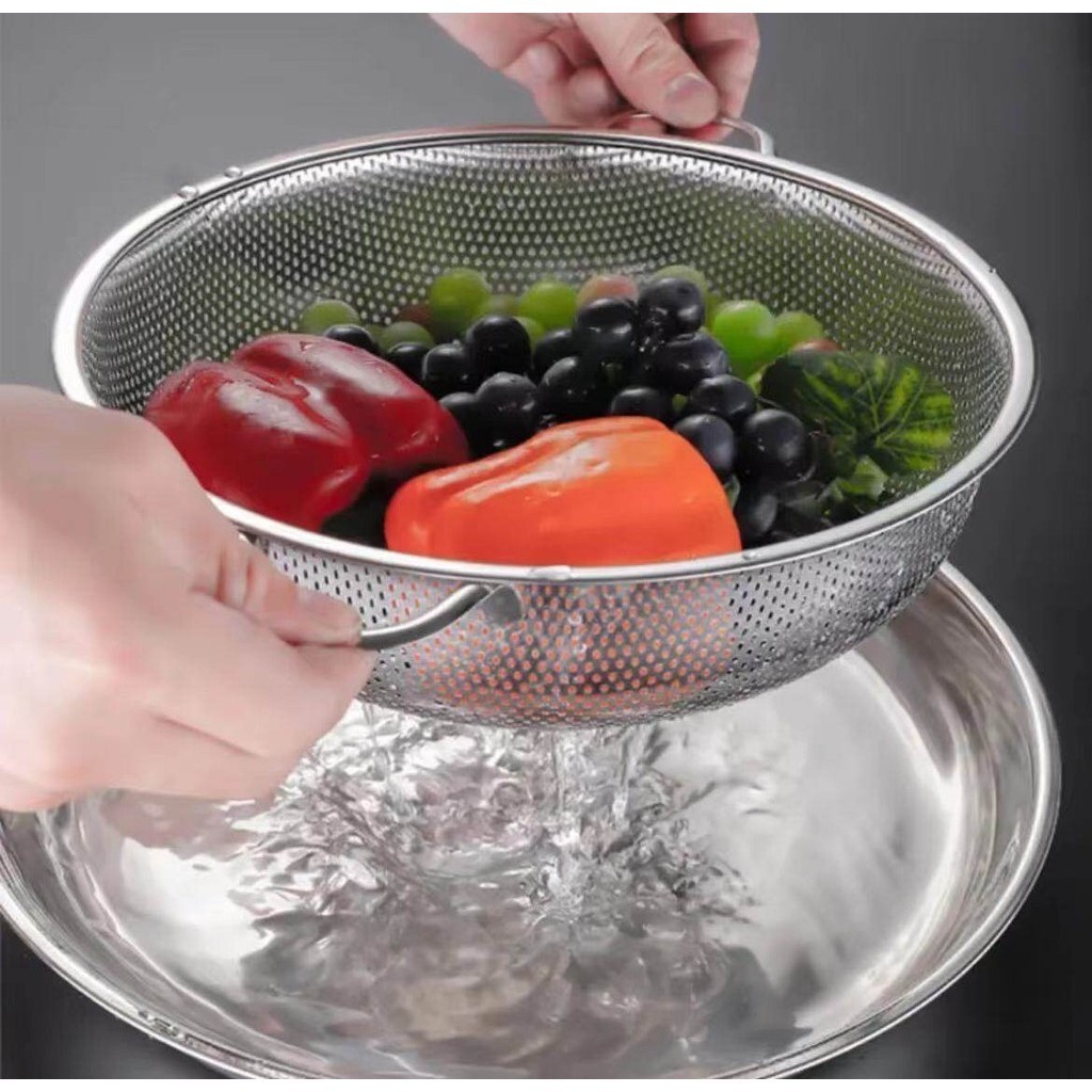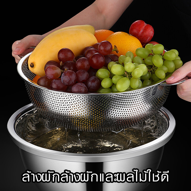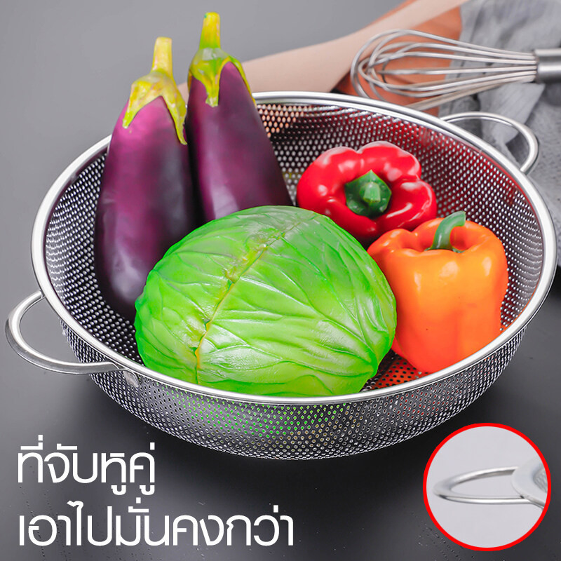 กระชอนสแตนเลส 2หู ตะกร้าล้างผัก ตะกร้าล้างผลไม้ทนทานล้างผัก ช้สำหรับล้างผักล้างผลไม้มีรูเจาะสแตนเลส