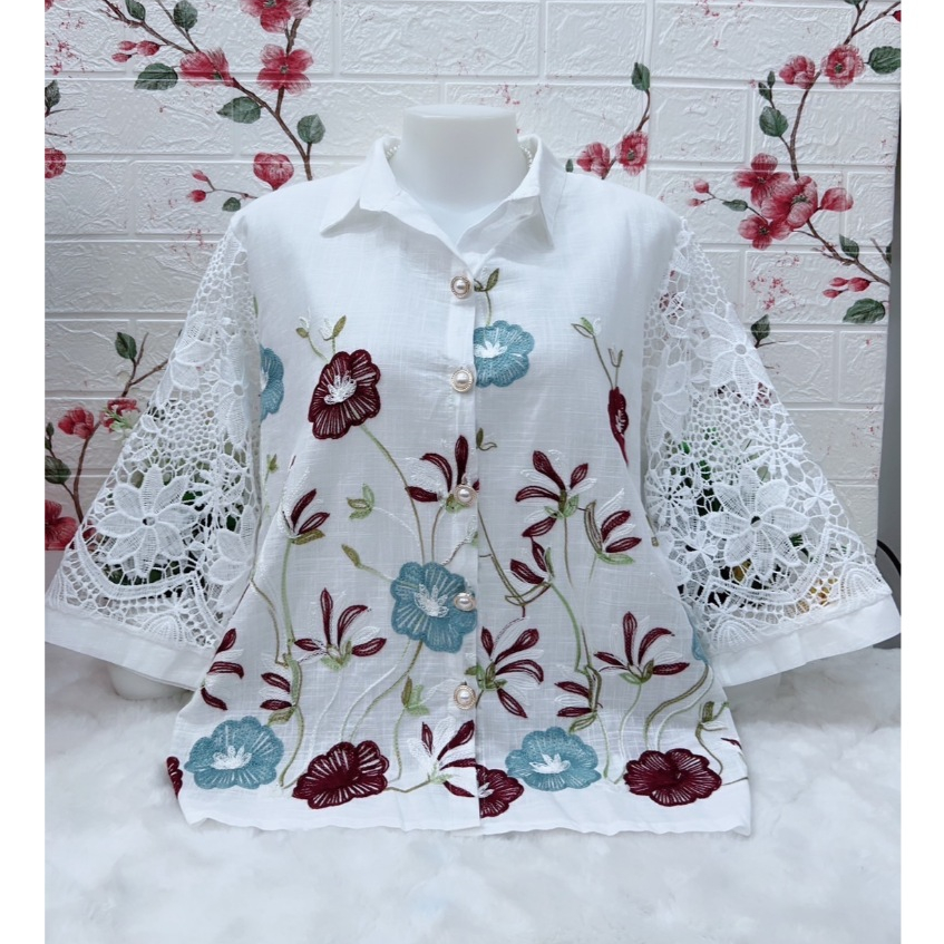 เสื้้อลูกไม้ผ้าลินิน รอบอก38-42/44-46/48-50-52/54-56นิ้ว ฟรีไซส์ หน้าผ้า46-52-56 มี3ไซส์ เสื้อลูกไม้คนสูงอายุใส่ทำบุญ