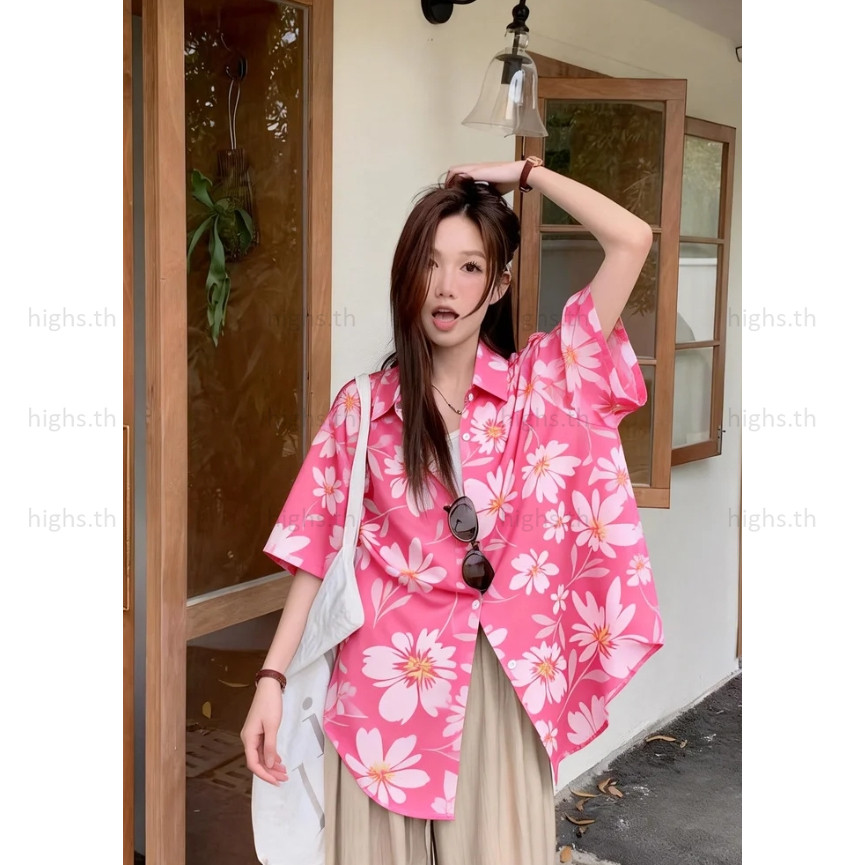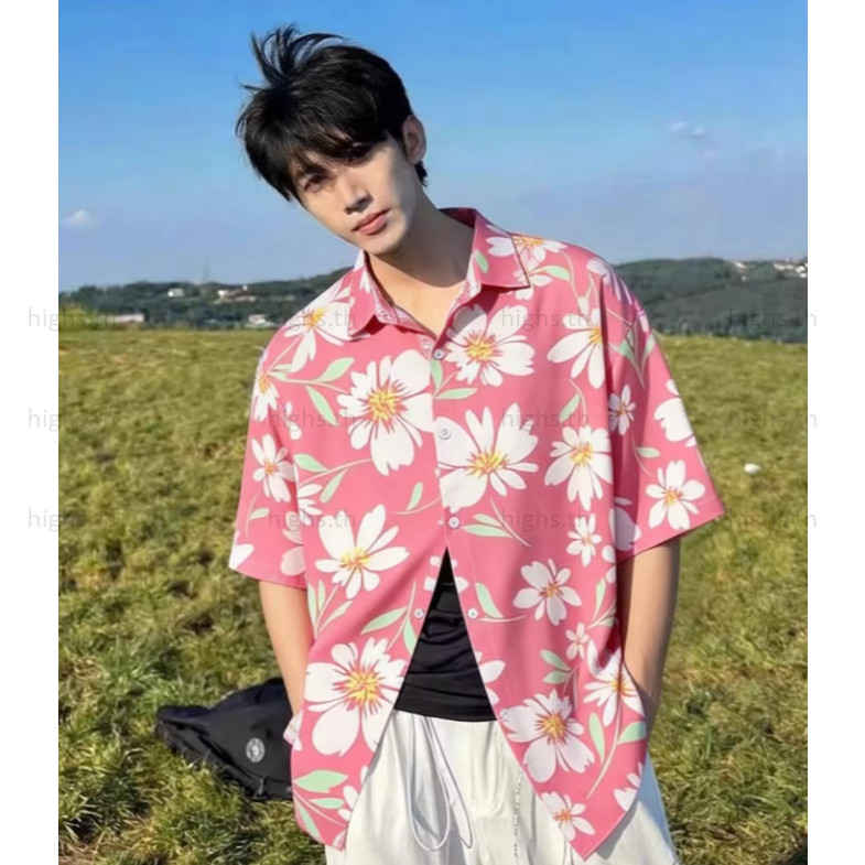 เสื้อเชิ้ตแขนสั้นลําลอง พิมพ์ลายดอกไม้ สีชมพู แฟชั่นฤดูร้อน สไตล์ฮาราจูกุ สําหรับผู้ชาย และผู้หญิง