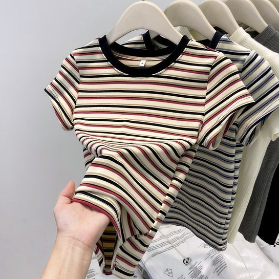 Y6Y - เสื้อยืดคอกลมแขนสั้นลายทางสำหรับผู้หญิง เสื้อครอปทรงเข้ารูปคุณภาพสูง มีสไตล์