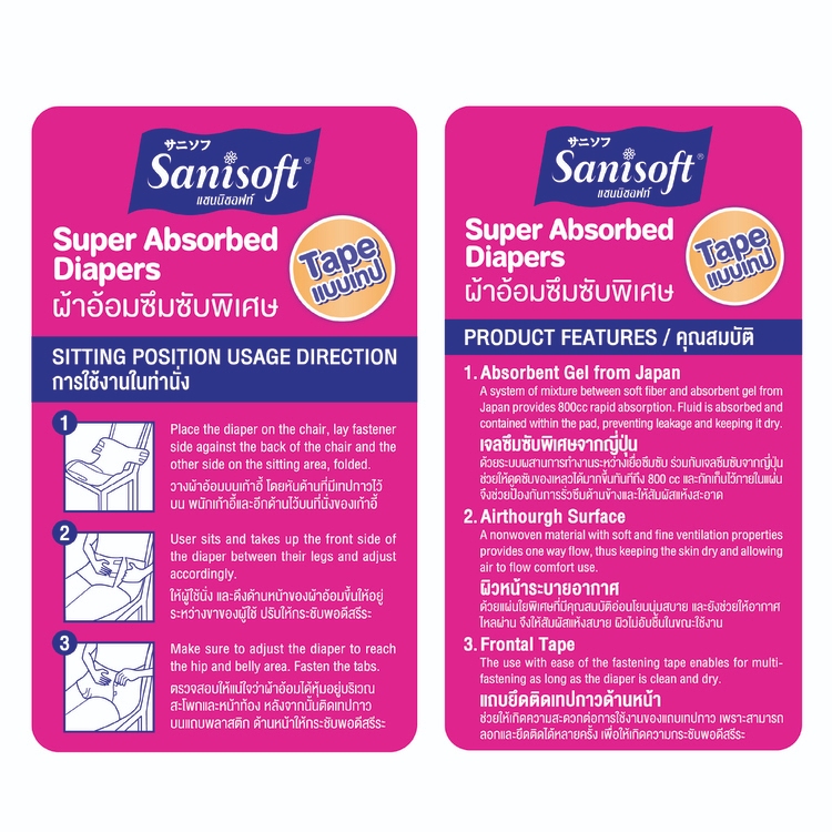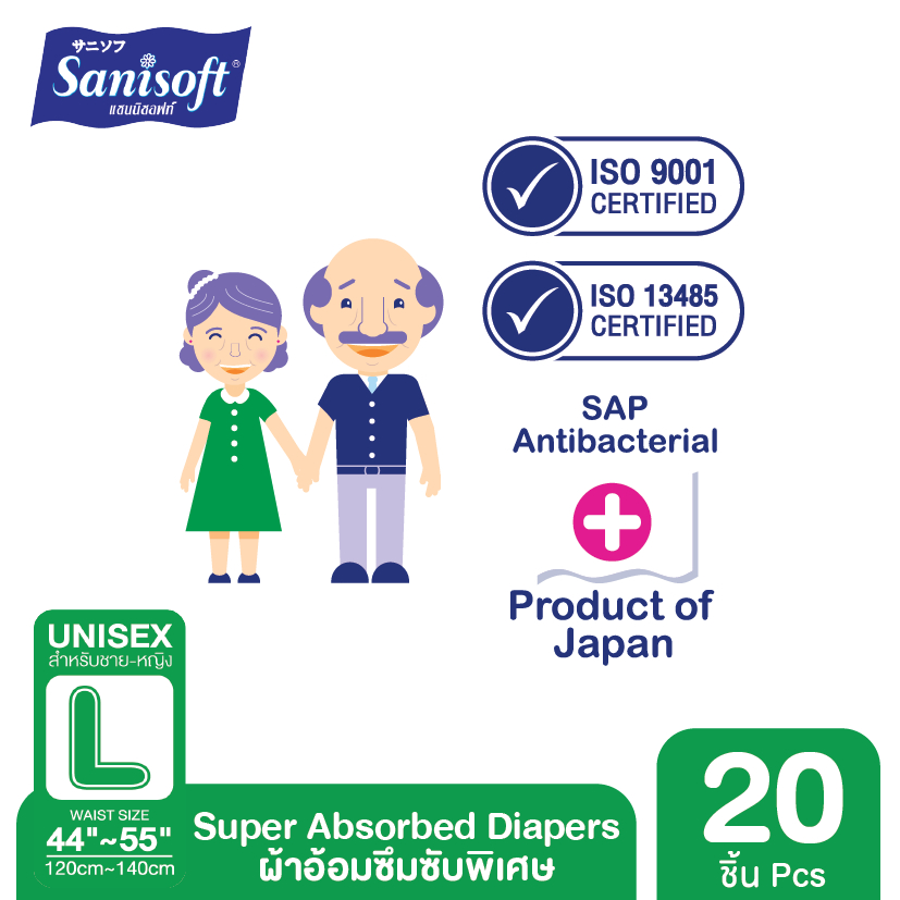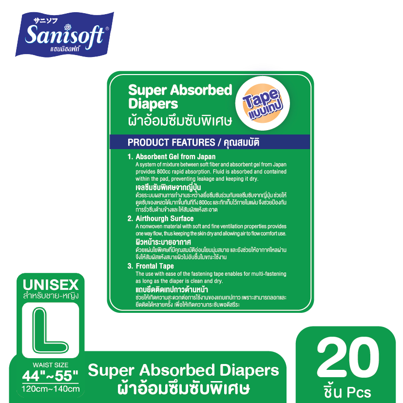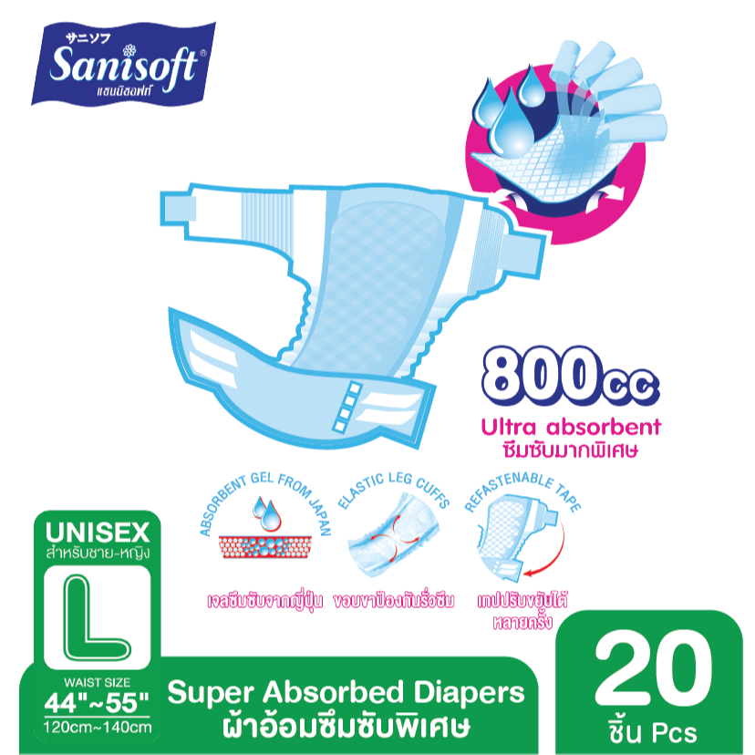 Sanisoft / แซนนิซอฟท์ ผ้าอ้อมผู้ใหญ่แบบเทป 800cc (ไซส์ L : 44 - 55นิ้ว/120-140ซม.) 20ชิ้น/ห่อ