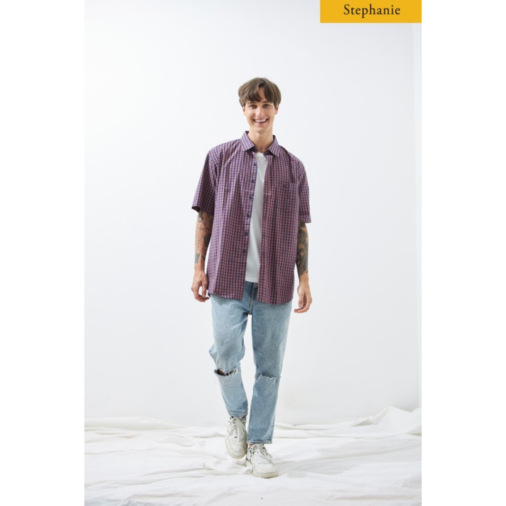 Stephanie เสื้อมีปก แขนสั้น เสื้อเชิ้ตสีน้ำเงินแดงลายสก็อต (ชาย) (OZ22NV)