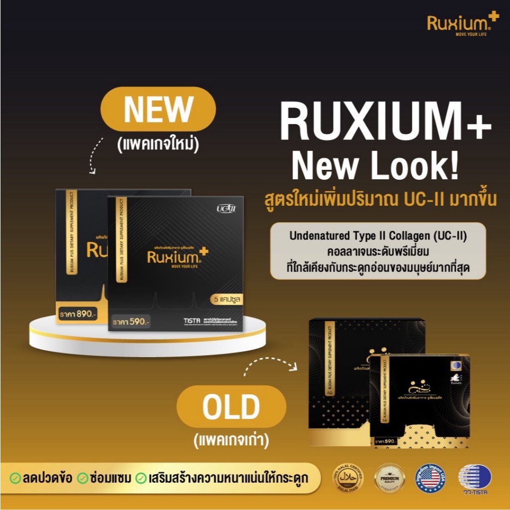 Ruxium plus รูเซี่ยมพลัส UC-ll แพ็คเกจใหม่ 1 กล่องเล็ก 5 แคปซูล สูตรใหม่ สำหรับผู้ปวดข้อ เข่า ข้อเสื่อม