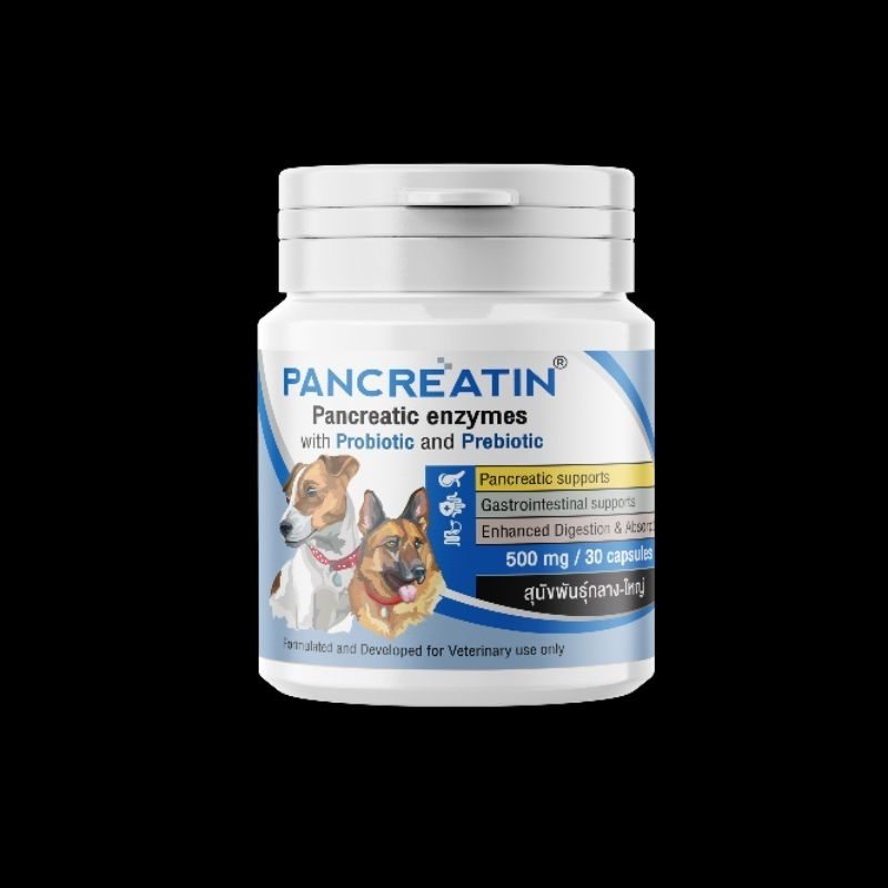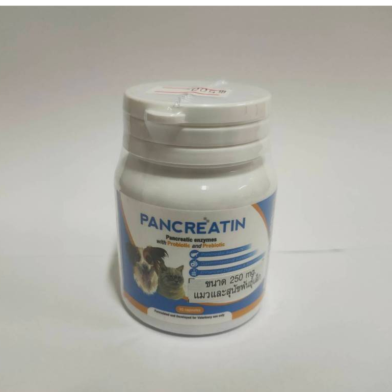 Pancreatin บรรจุ 30 แคปซูล เอ็นไซม์เสริมอาหาร สำหรับสุนัขและแมวที่มีภาวะตับอ่อนอักเสบ (แพนครีเอทิน)