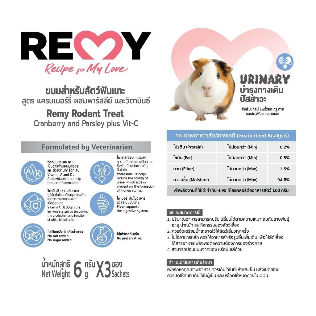 REMY เรมี่ ขนมสำหรับสัตว์ฟันแทะ สูตรแคนเบอร์รี่ผสมพาร์สลีย์อบแห้ง วิตามินซี ดูแลทางเดินปัสสาวะ x1 ถุง (3ชิ้น)