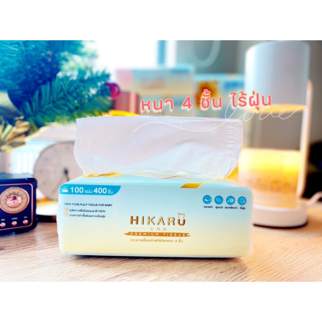 ฮิคารุทิชชู่พรีเมียมหนา 4 ชั้น ไร้ฝุ่น 1 แพ็คหูหิ้ว 4 ห่อ (ริบบิ้น)