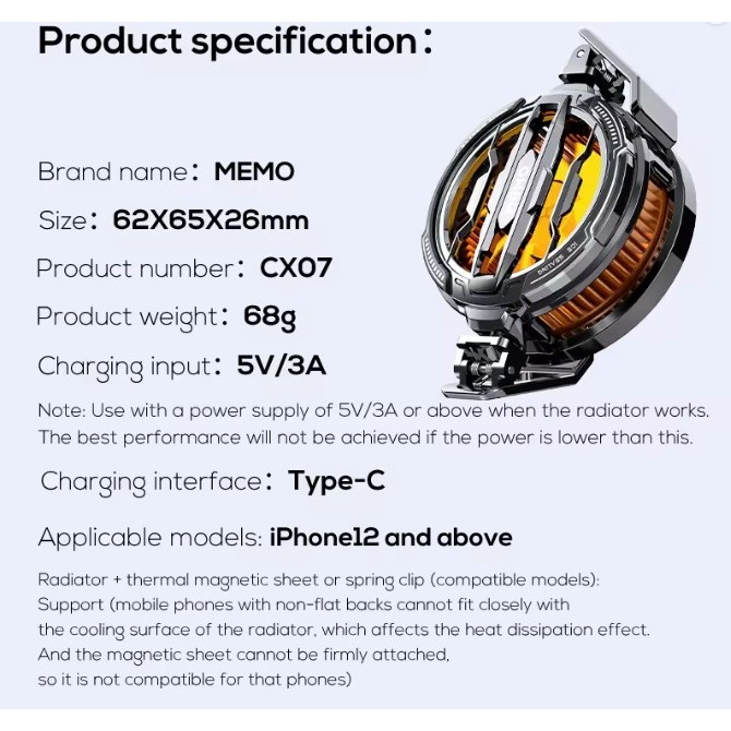 พัดลมระบายความร้อนมือถือ แท็บเล็ต MEMO CX07 แบบแม่เหล็ก พร้อมขาหนีบถอดได้ มีประกัน 3 เดือน