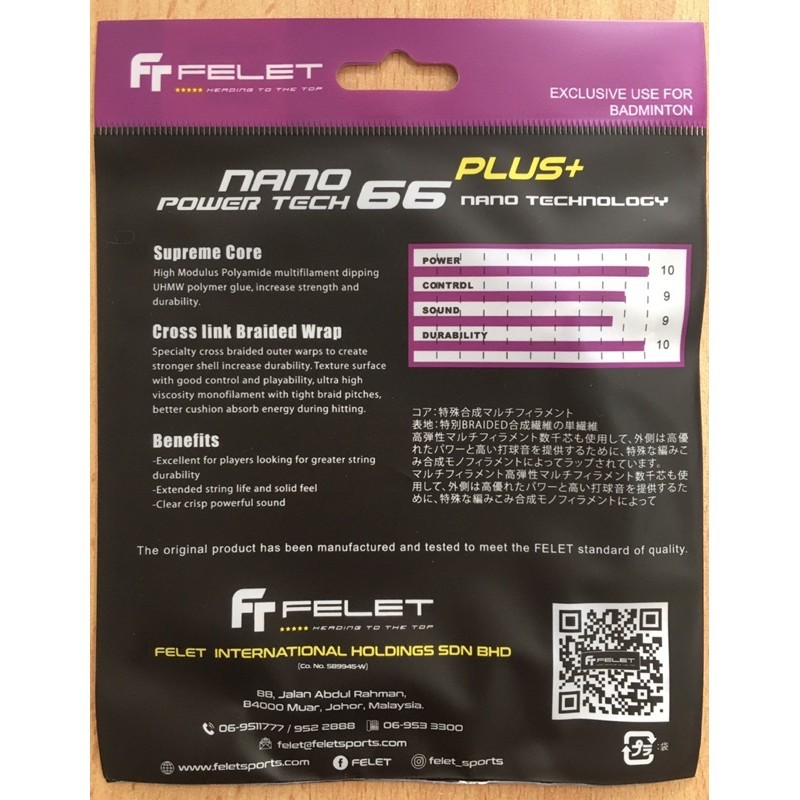 เอ็นแบดมินตัน Felet Nano Power Tech 66 Plus+ (0.66มม.) สินค้าลิขสิทธิ์แท้ 100%