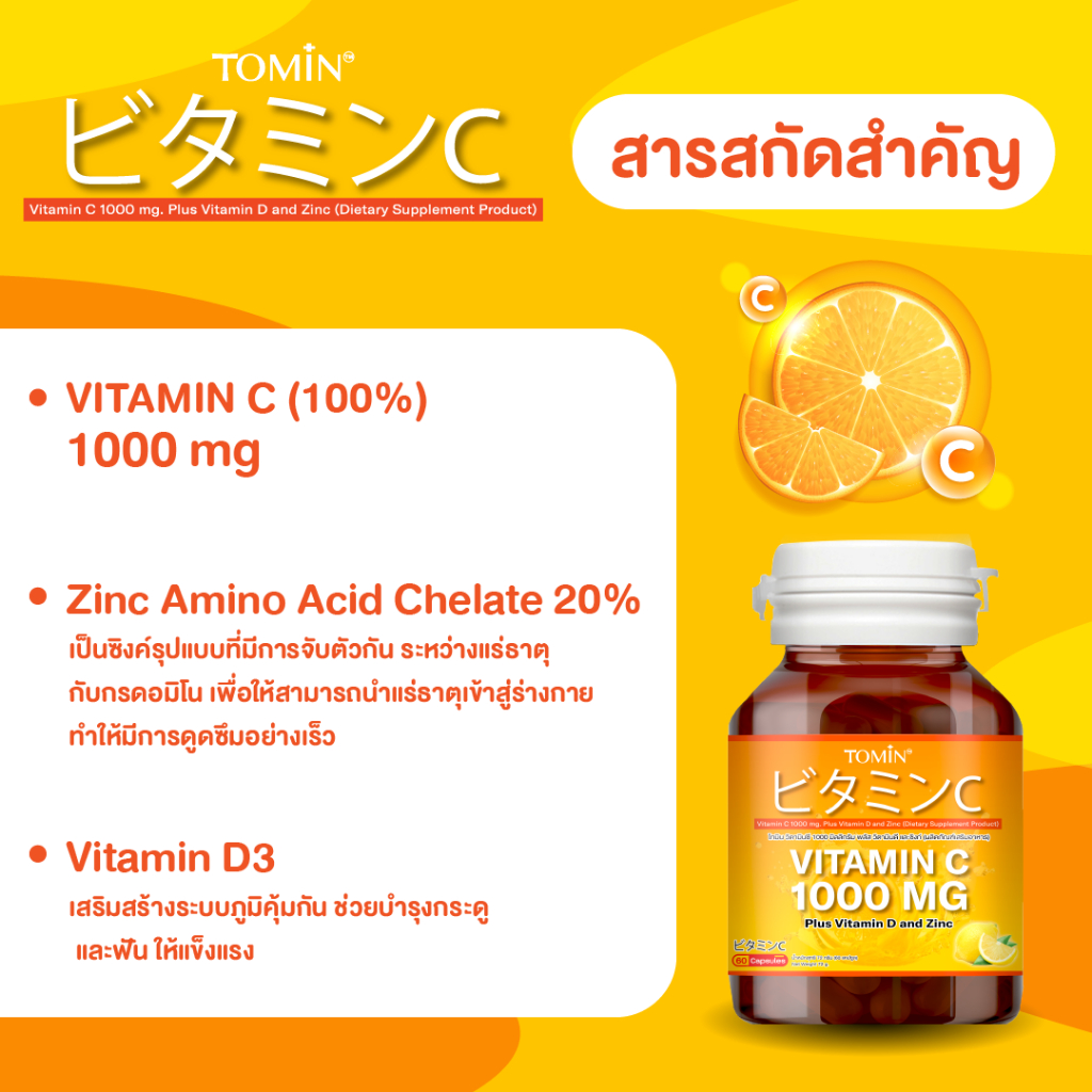 Tomin™ Vitamin C1000 MG ( 60แคปซูล/60วัน) วิตาซี พลัส วิตามินดี ซิงก์ เสริมภูมิ ป้องกันหวัด ผิวขาวใส