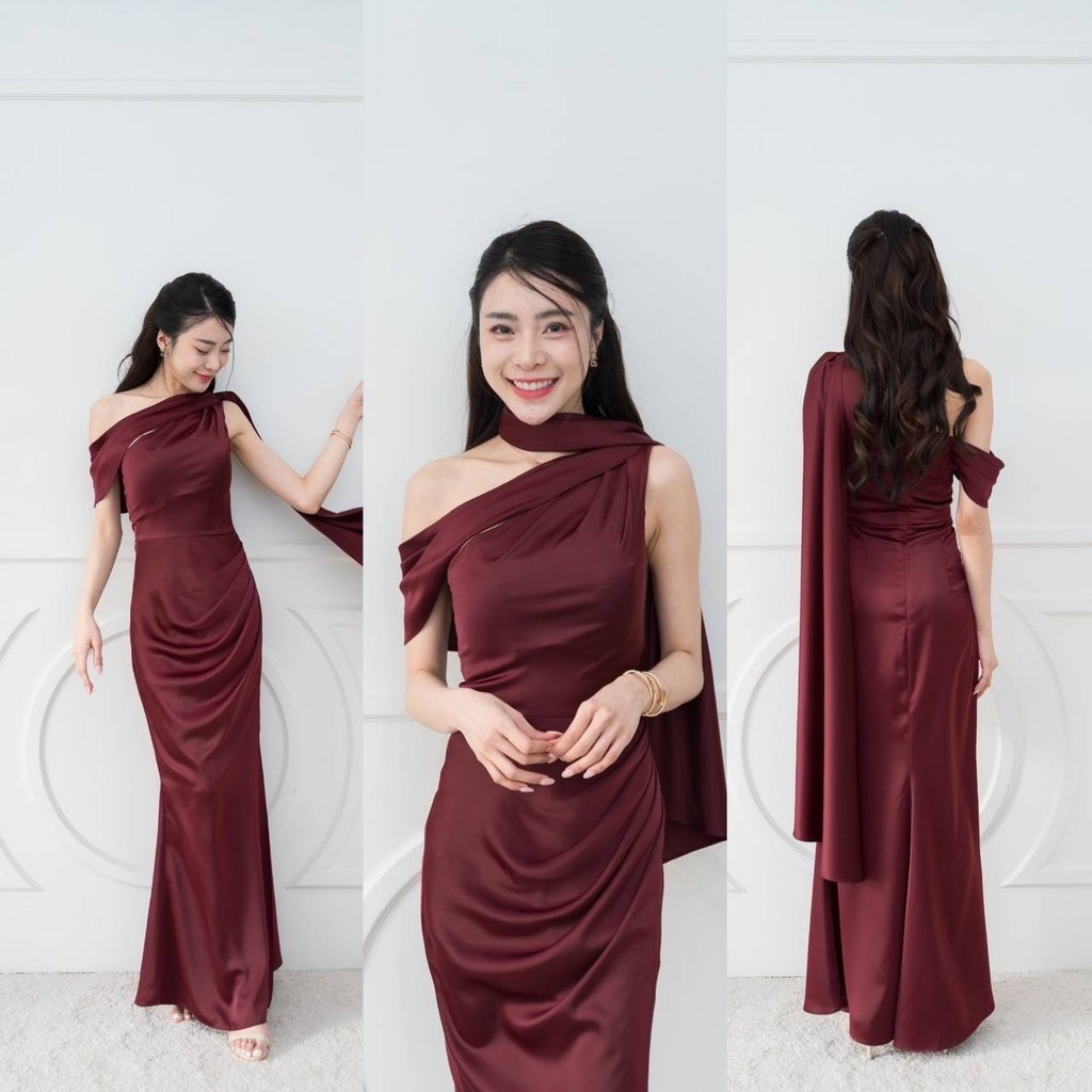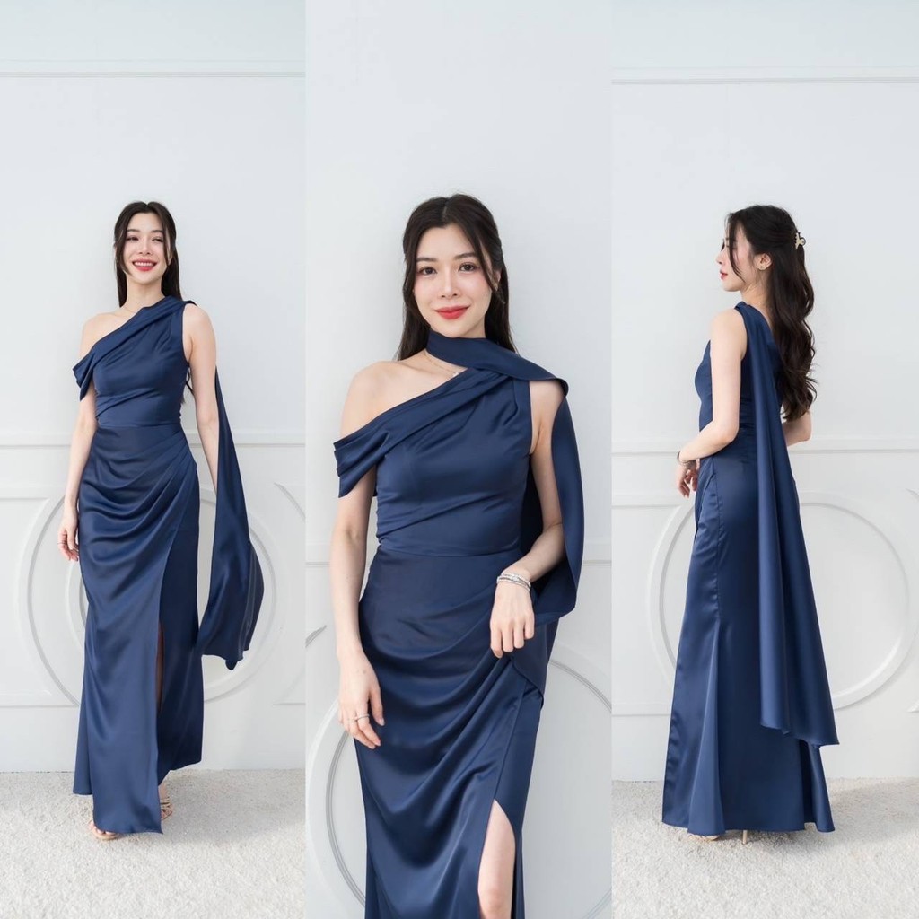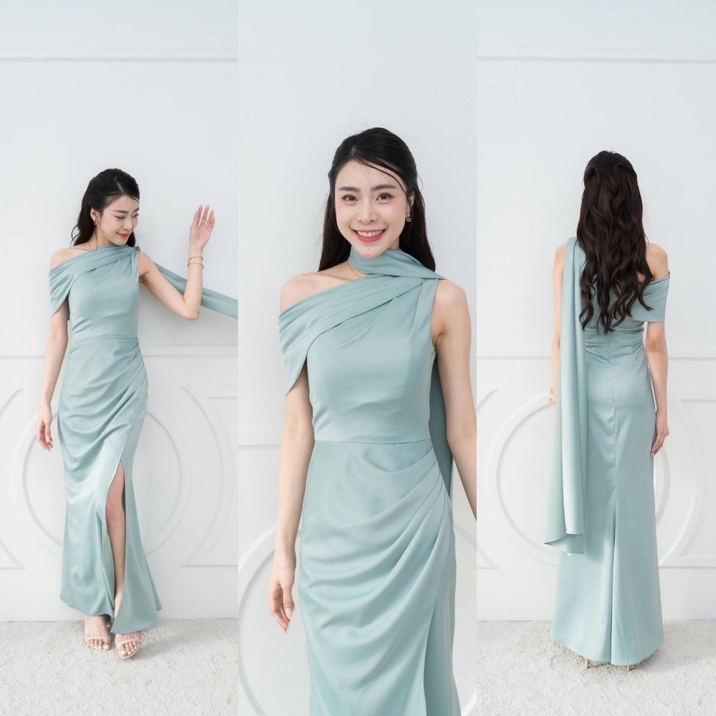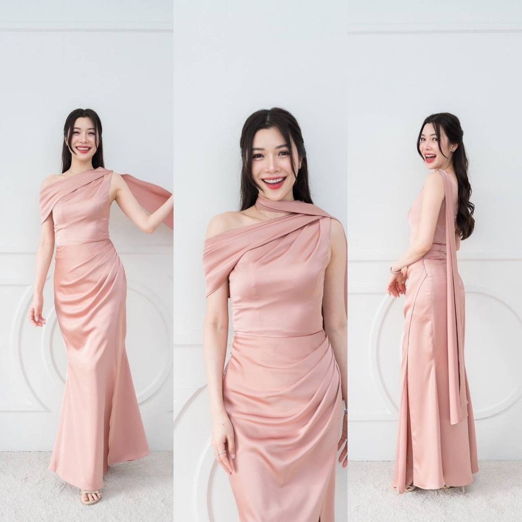 เดรสยาว ชุดไปงานแต่ง เดรส ชุดราตรี A298 ไหล่เบี่ยง สไบ อ้อมแขน ผ้าเครปซาติน เสื้อผ้า ผู้หญิง Dress