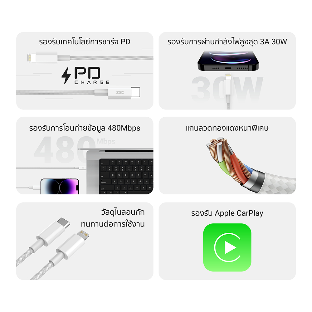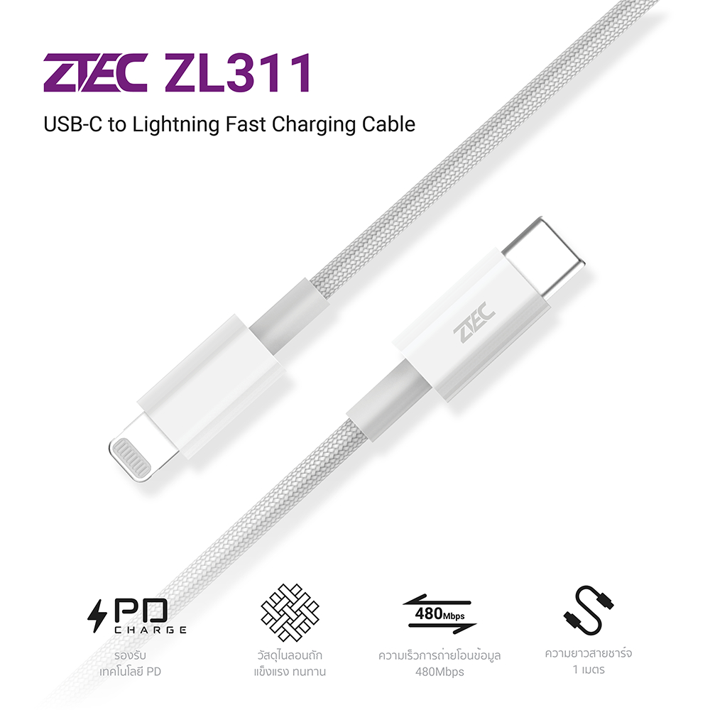 [ลดเหลือ 166] ZTEC (รวมสายชาร์จสำหรับ iPhone ทุกรุ่น) Type C to Lightning / C to C รองรับเทคโนโลยีชาร์จเร็ว PD -2Y