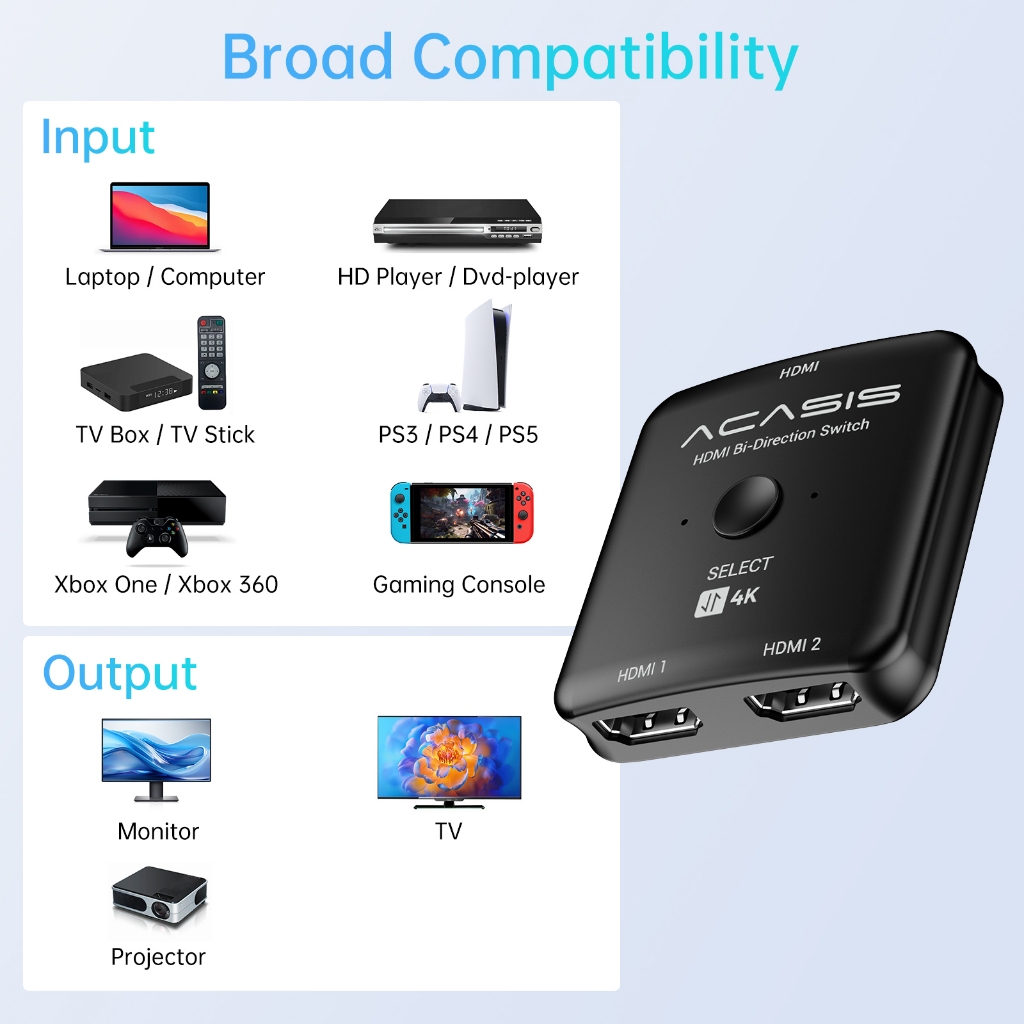 Acasis สวิตช์แยก HDMI 4K@60hz HDMI 2.0 เข้า 2 ออก 1 เข้า 2 รองรับ 4K 3D HDR สําหรับ Xbox PS5 4 3
