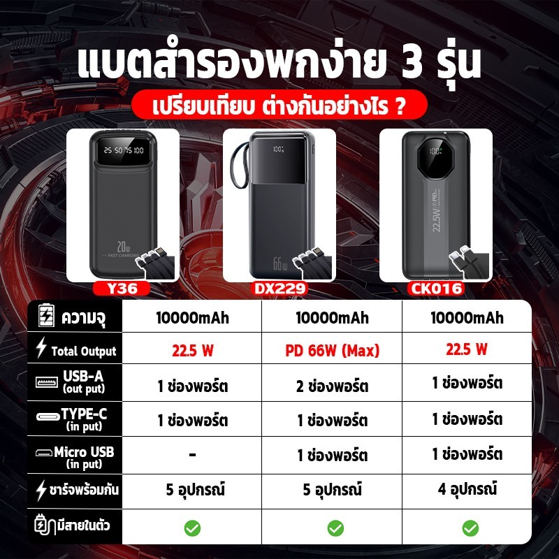 【รับประกัน 2 ปี】3Cแบตสำรอง 10000mAh ชาร์จเร็วPD 66W สายในตัว4เส้น QC3.0 FastCharging powerbank ใช้ได้กับทุกรุ่นทุกยี่ห้อ