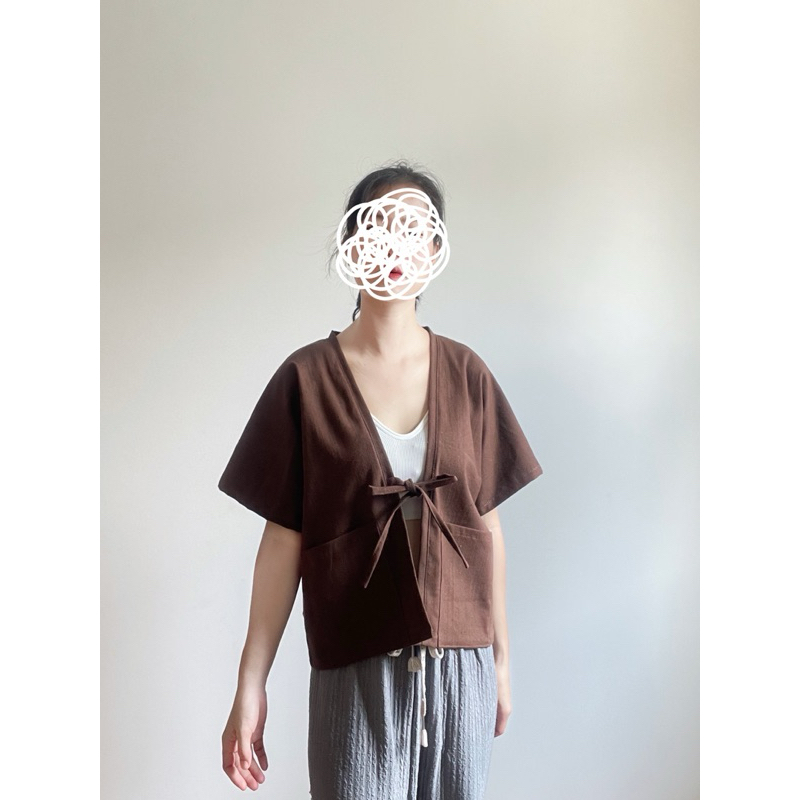 เสื้อคลุมแขนสั้นผ้าฝ้ายเนื้อนุ่ม เสื้อครอปแขนสั้น ดีเทลผูกโบหน้าสไตล์มินิมอล