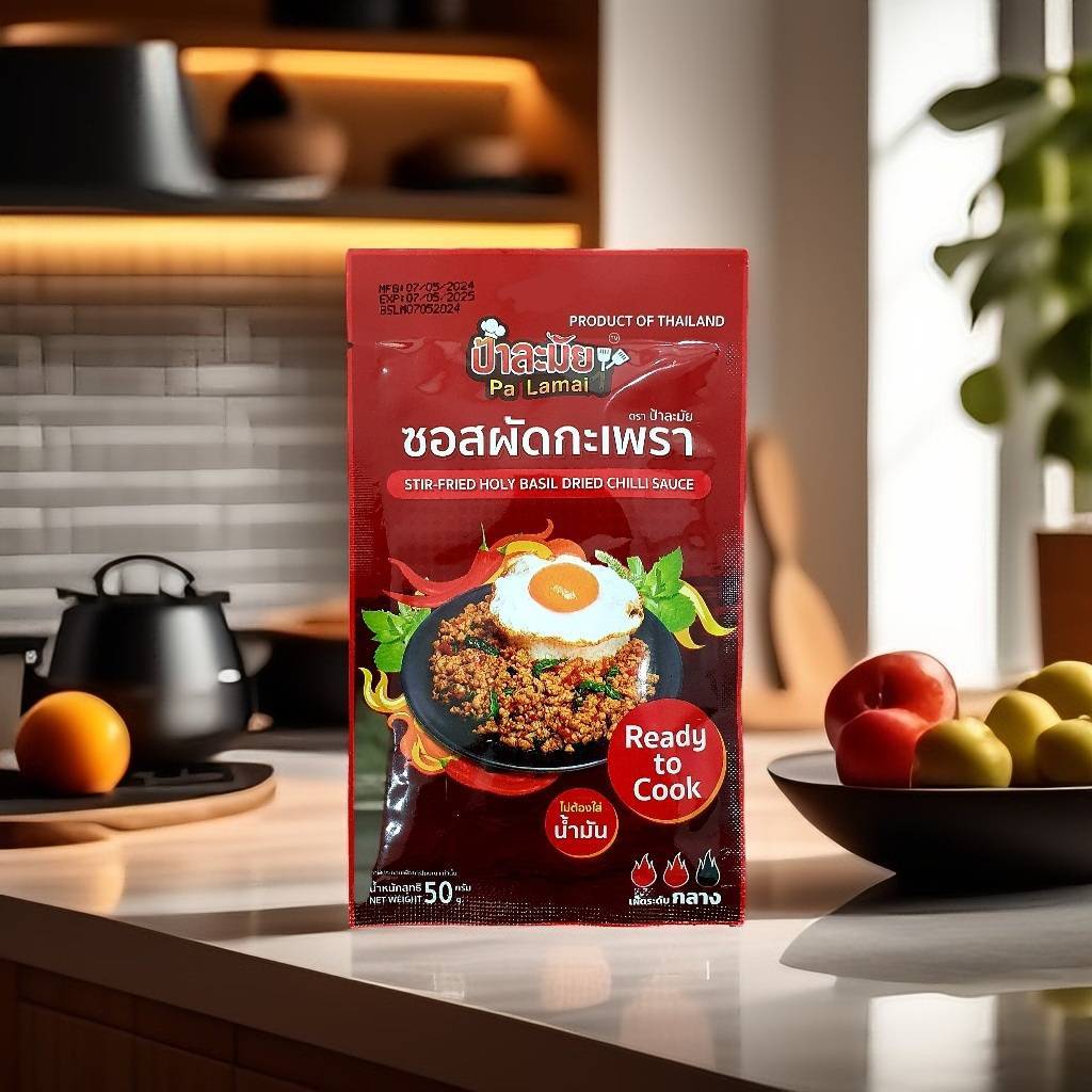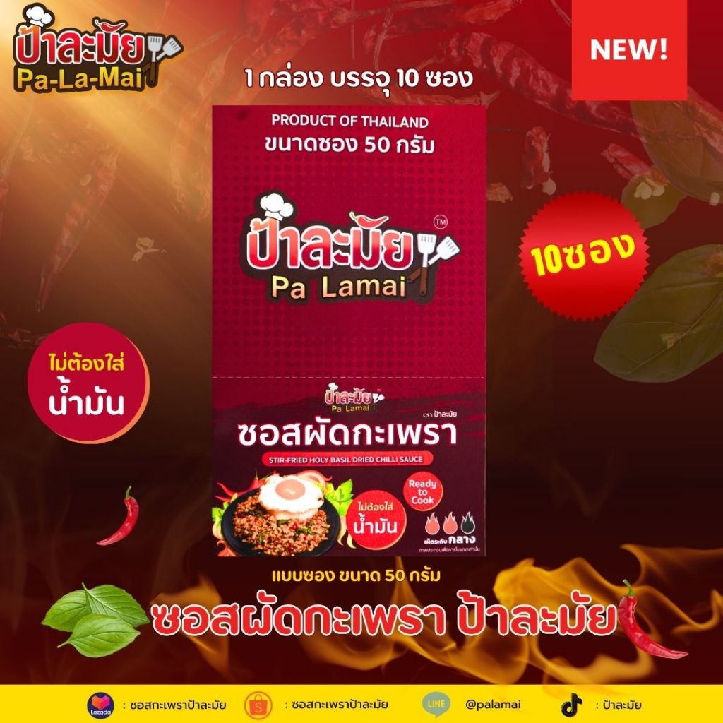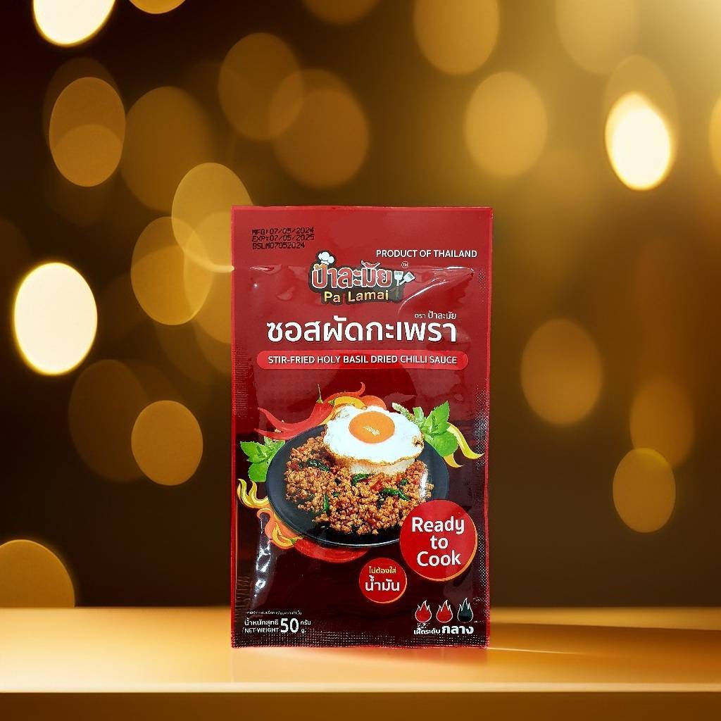 ซอสกะเพราป้าละมัย (สูตรพริกแห้ง ไร้น้ำมัน) แบบซอง 50 กรัม ยกกล่อง 10 ซอง