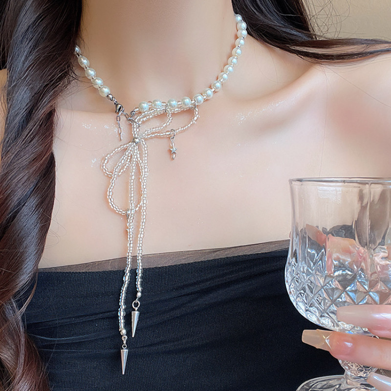 มุกโบว์พู่สร้อยคอสําหรับผู้หญิงแฟชั่นคริสตัลลูกปัดโบว์สร้อยคอสําหรับสาวๆเย็นมุกดาวโซ่สร้อยคอชุดอุปกรณ์เสริมเครื่องประดับ