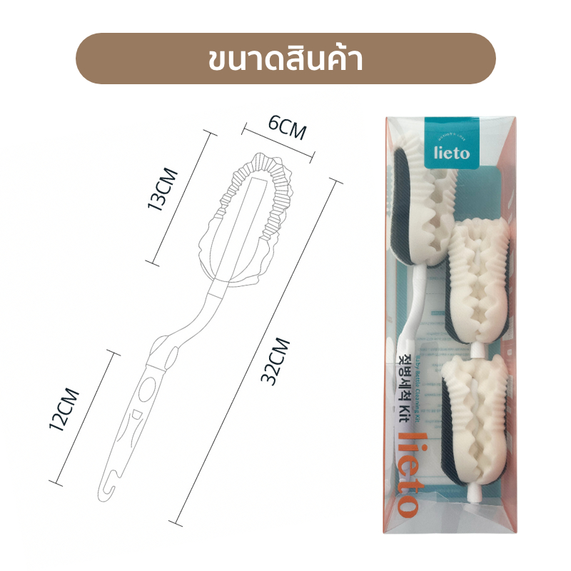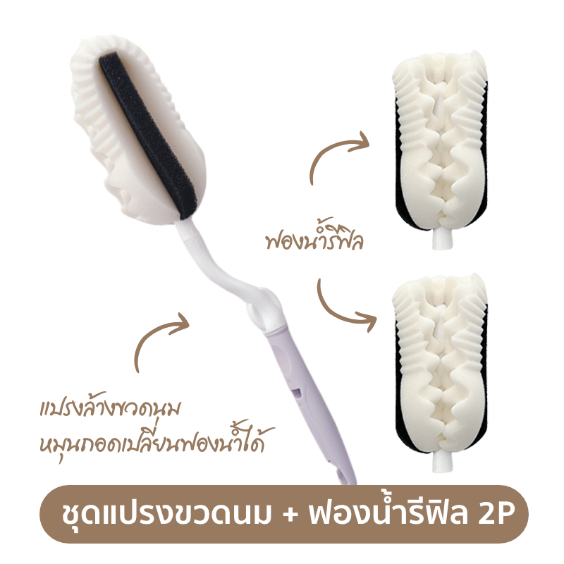Lieto ชุดแปรงล้างขวดนม + ฟองน้ำรีฟิล 2P (ด้ามจับสีเทาหมุนและตรง ไม่สามารถเปลี่ยนฟองน้ำได้)
