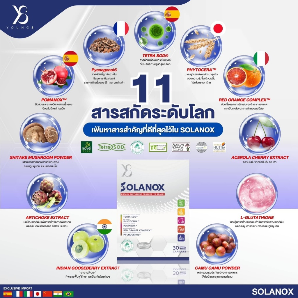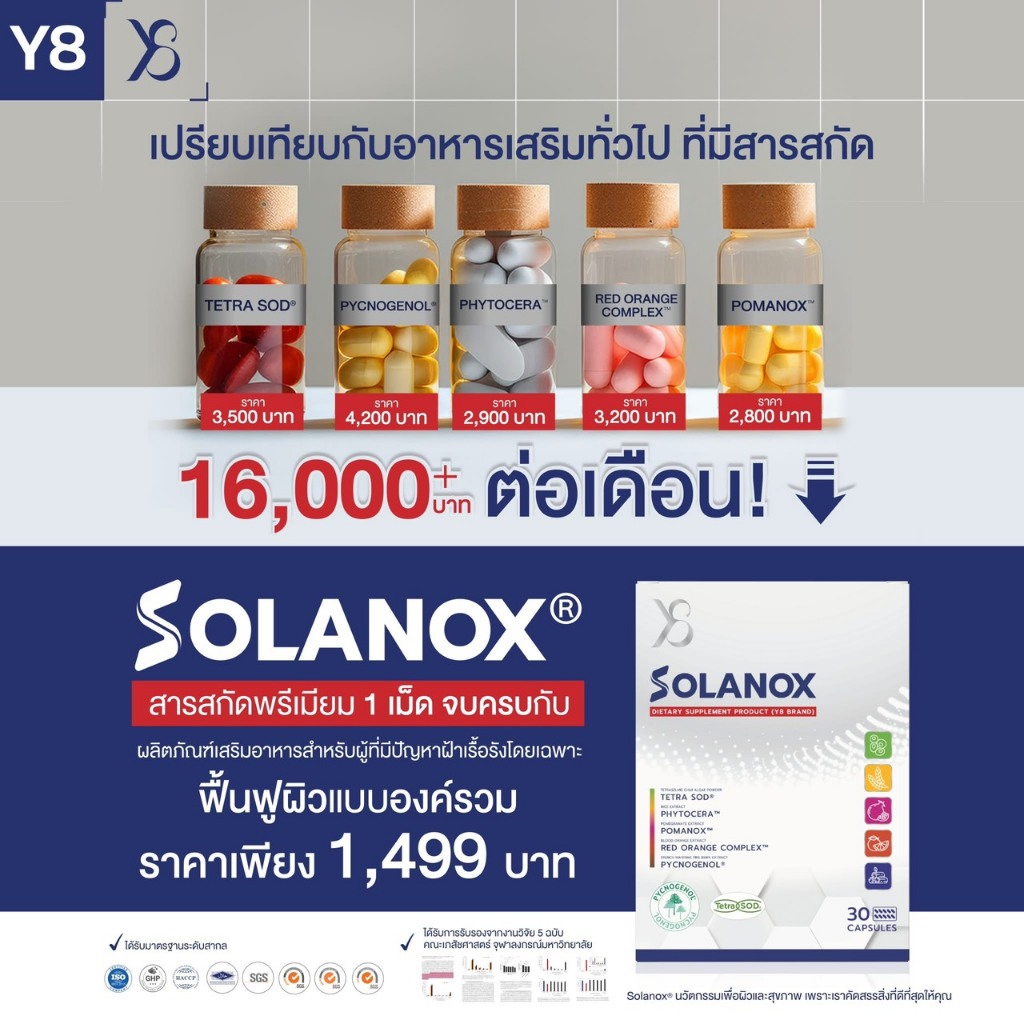 Y8 Solanox อาหารเสริม บำรุงผิวขั้นสุด 30แคปซูล/แป้งสกินแคร์/เซรั่มลูมิเทค/กันแดด ส่งฟรี