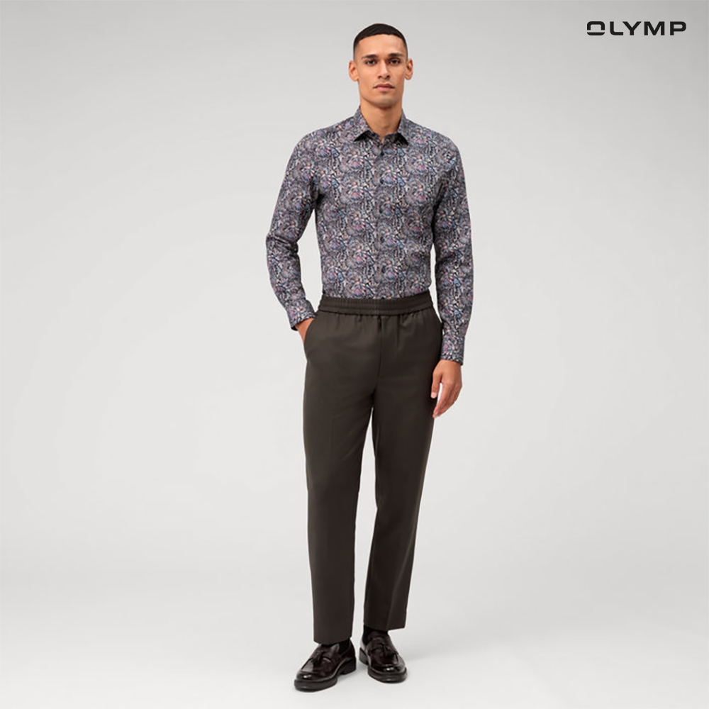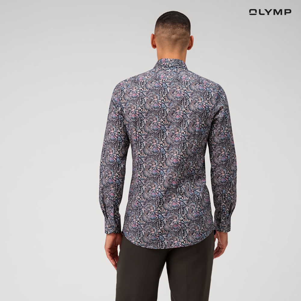 OLYMP Level Five Shirt เสื้อเชิ้ตชาย ผ้าเรียบลายพิมพ์ สีกรมท่าทรงพอดีตัว ยืดหยุ่นได้ดีรีดง่าย SUMM24 SP