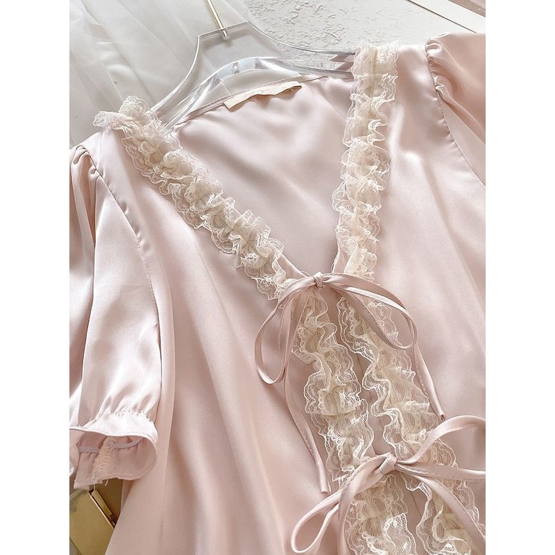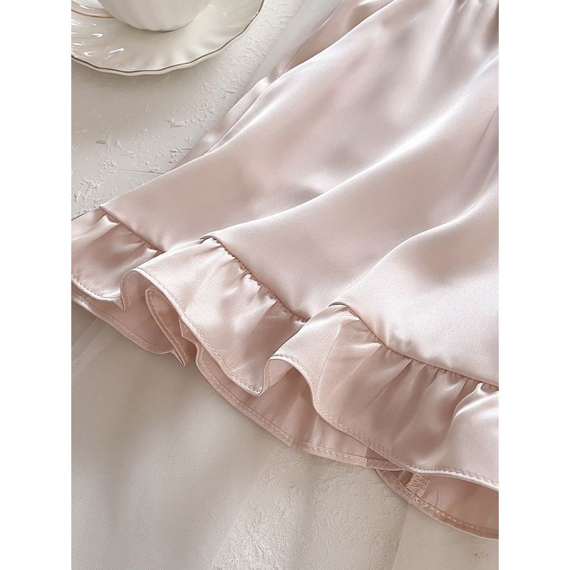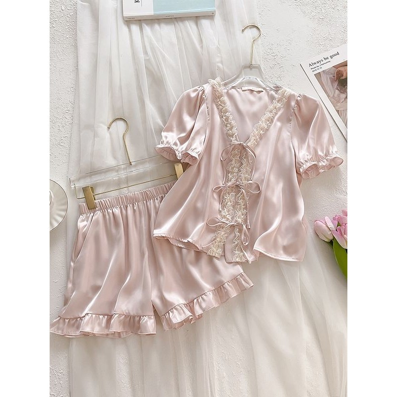 Fxdazi * ชุดนอนน ่ ารักสไตล ์ เจ ้ าหญิงหวานชุดนอนระดับไฮเอนด ์ ผู ้ หญิงสีทึบกางเกงขาสั ้ นแขนสั ้ นผ ้ าไหมน ้ ําแข ็ งเซ ็ กซี ่ ชุดบริการบ ้ านฤดูร ้ อน