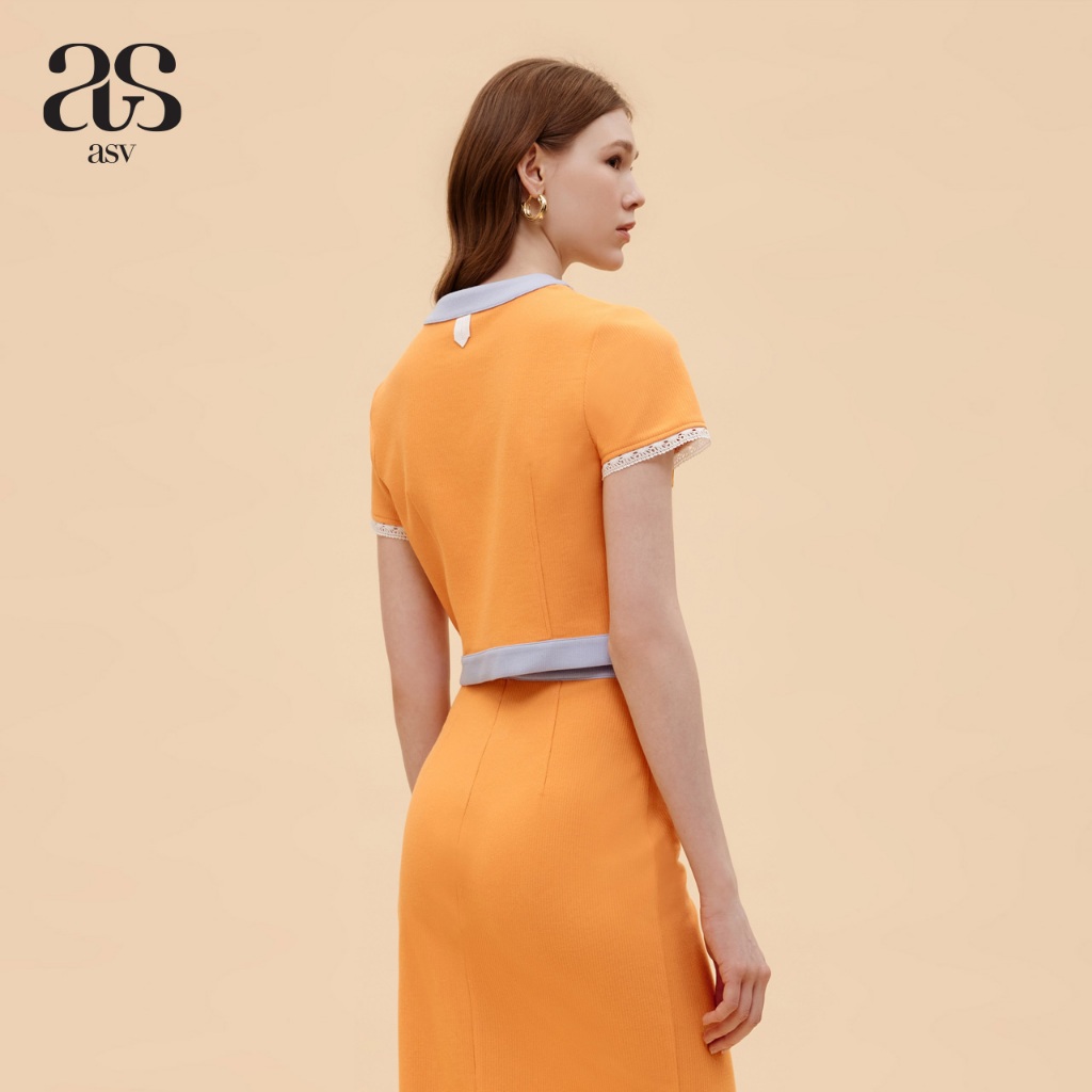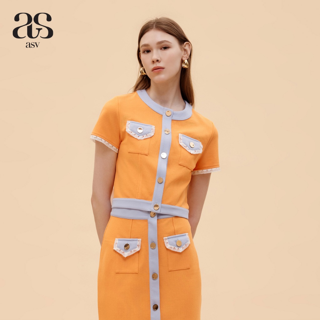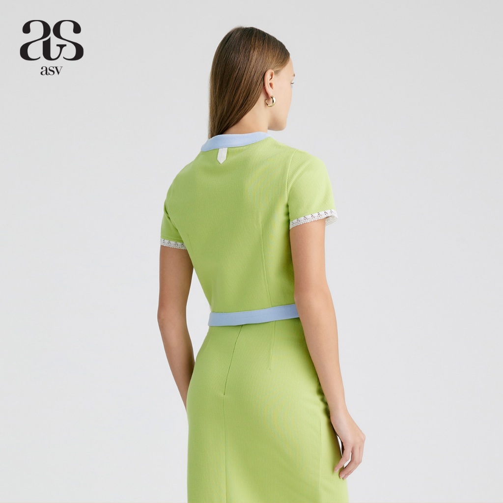 [asv ss24] Gemy Cropped Top เสื้อผู้หญิง แขนสั้น ตกแต่งกระเป๋าหน้าและเทปปีเก้ แต่งผ้ากุ๊นและลูกไม้ที่ชายเสื้อ