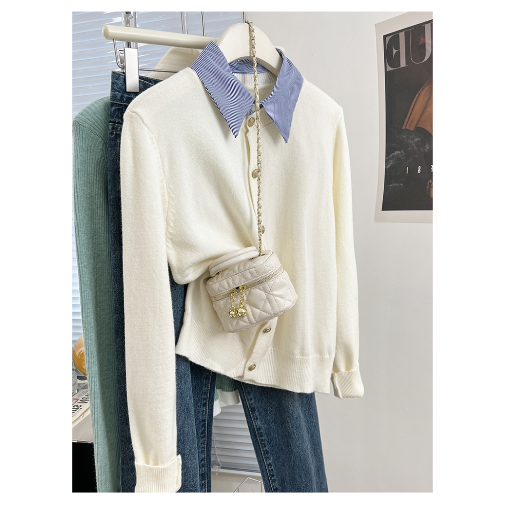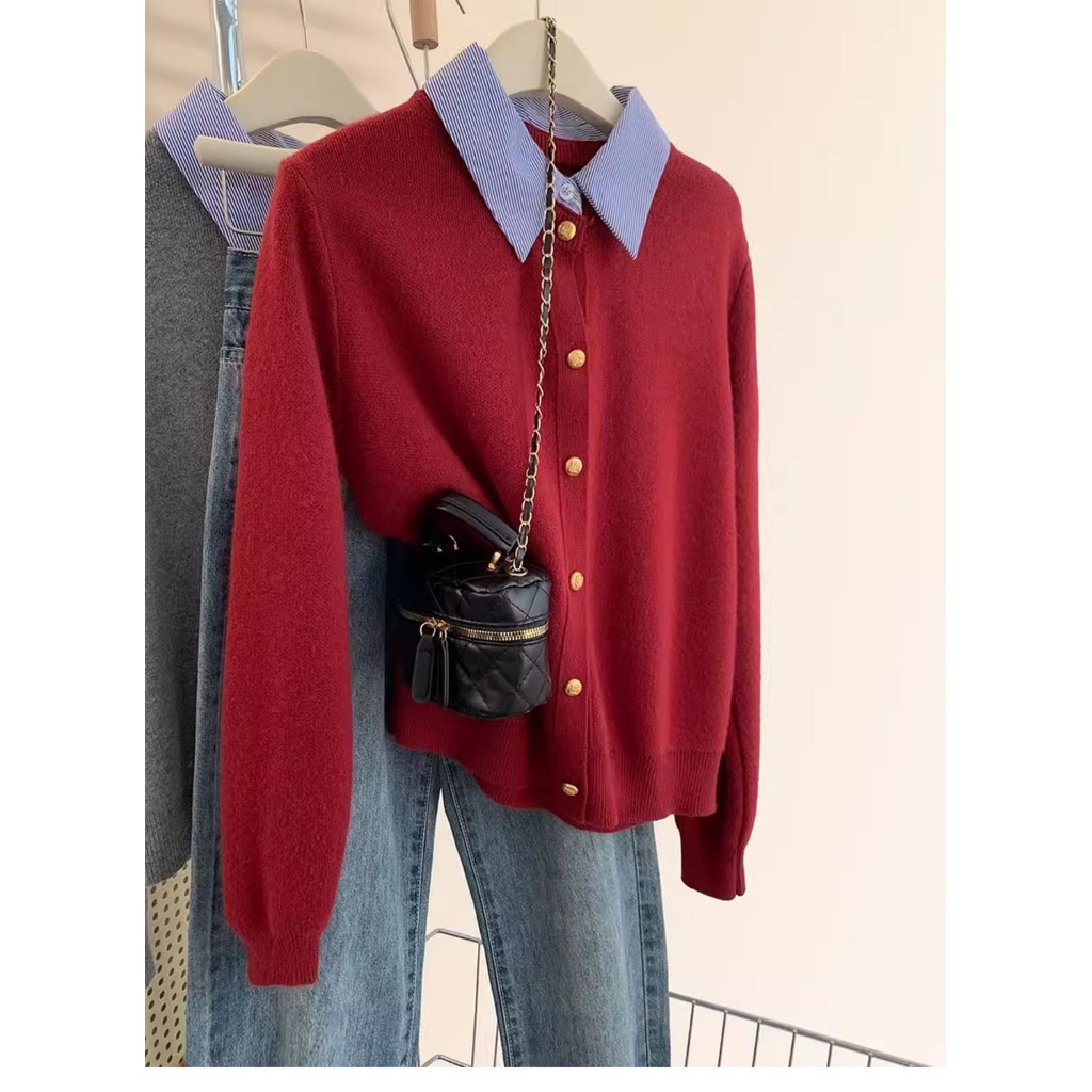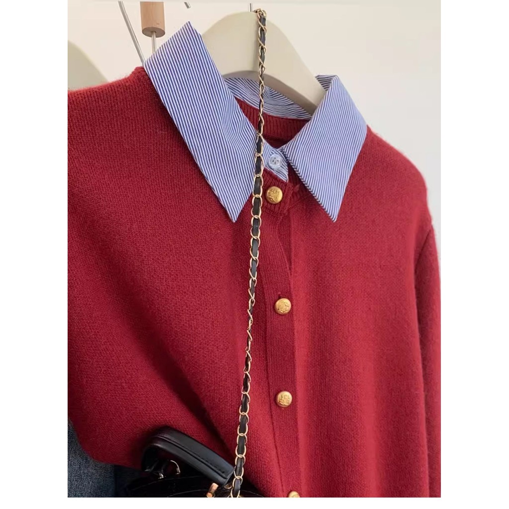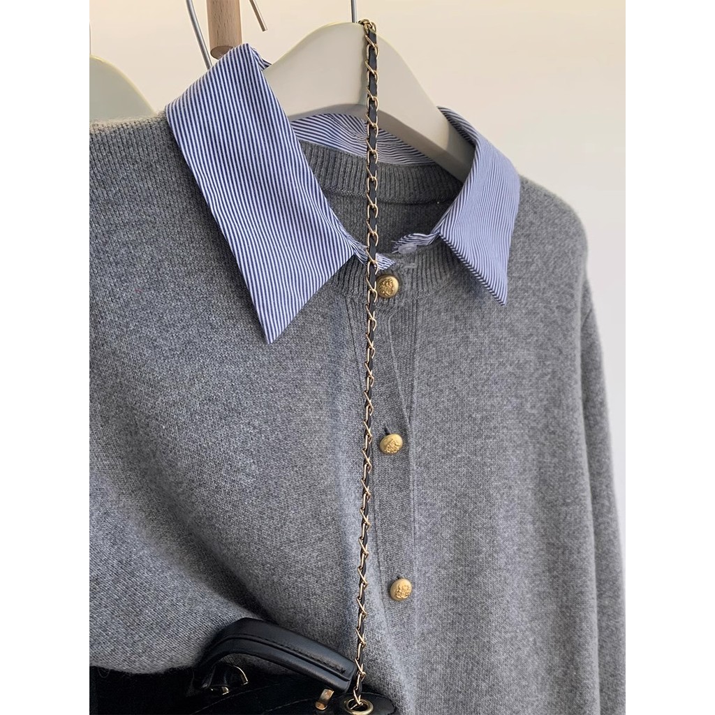 ฝรั่งเศสย้อนยุคฤดูใบไม้ร่วงใหม่เย็บปะติดปะต่อกันแขนยาวถักเสื้อกันหนาวเสื้อกันหนาวผู้หญิง 240922