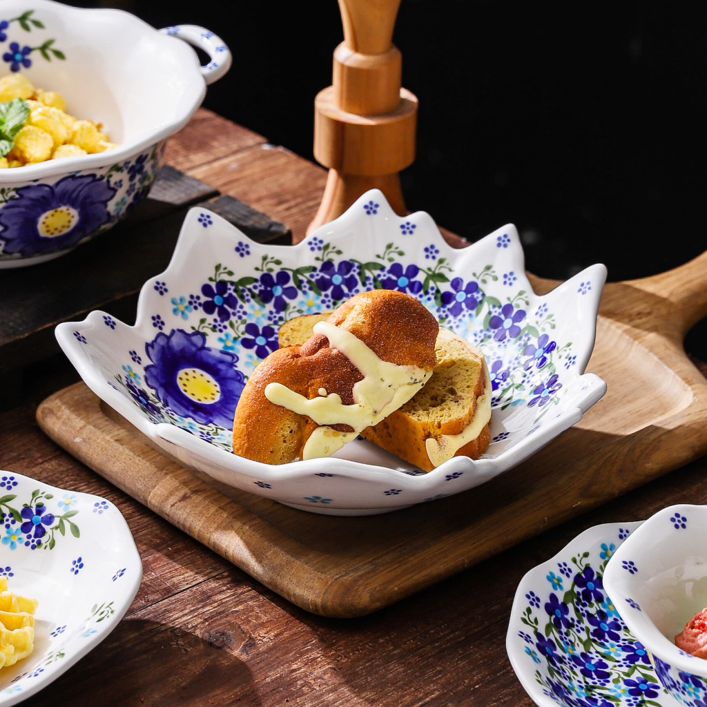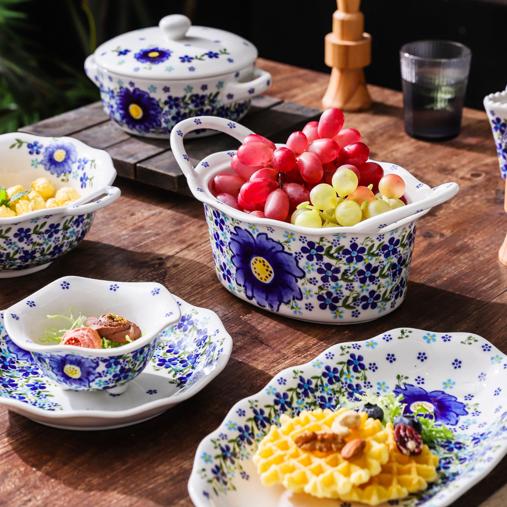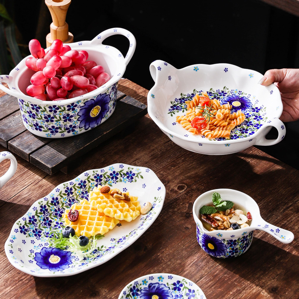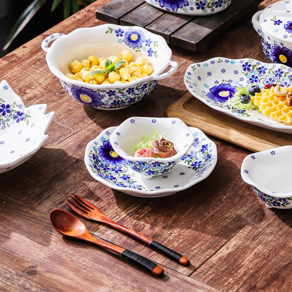 HongDian ชุดเครื่องใช้บนโต๊ะอาหารเซรามิกสีน้ำเงินลายดอกไม้ underglaze ทำความสะอาดง่าย ปลอดภัยทนความร้อนสูง ใช้กับ microwave oven เครื่องล้างจานและเตาอบได้ รวมหม้อมีฝาปิด pot ชามเซรามิก ชามขอบดอกไม้ ชามหูคู่ จานและถาดอบ ceramic porcelain bowl plate cup