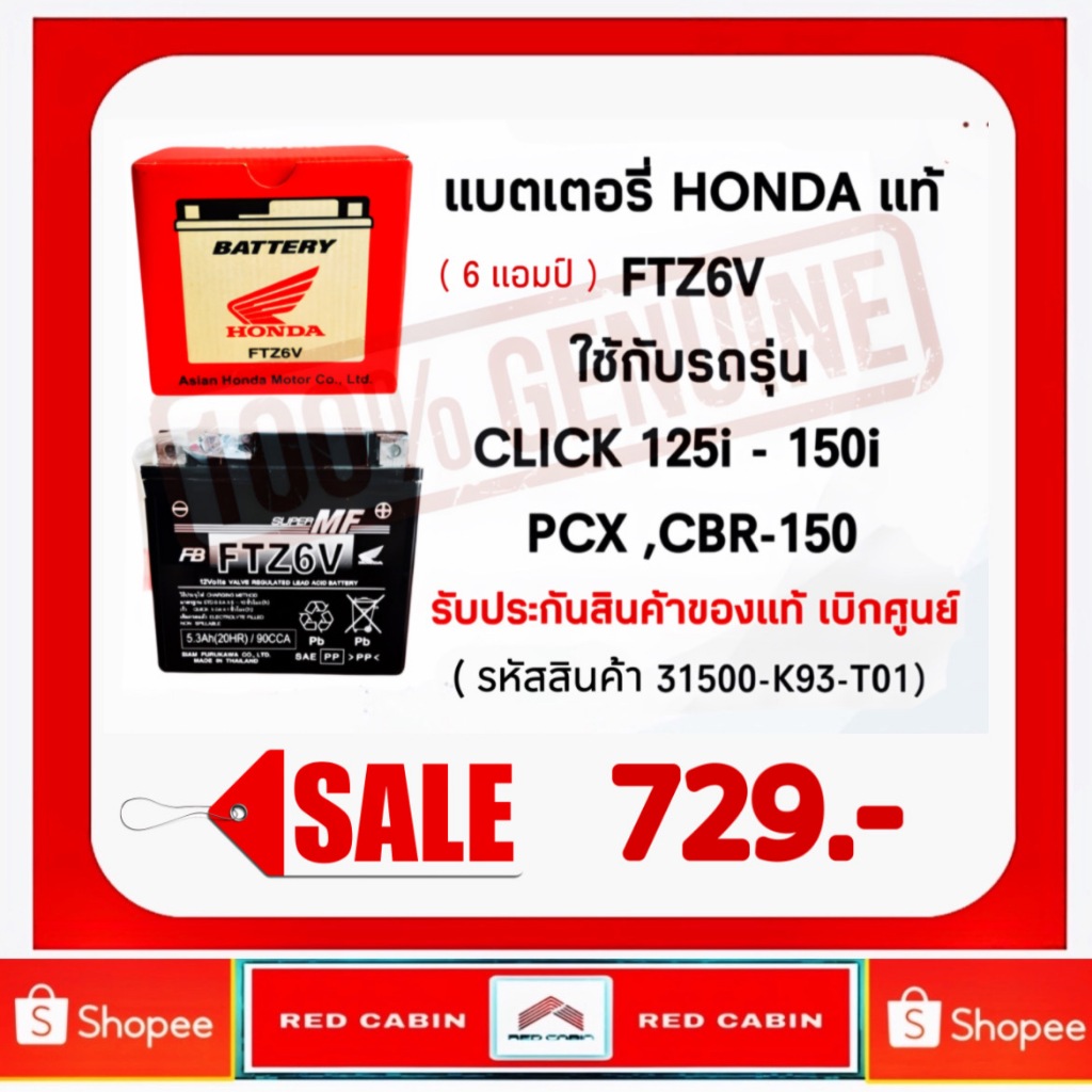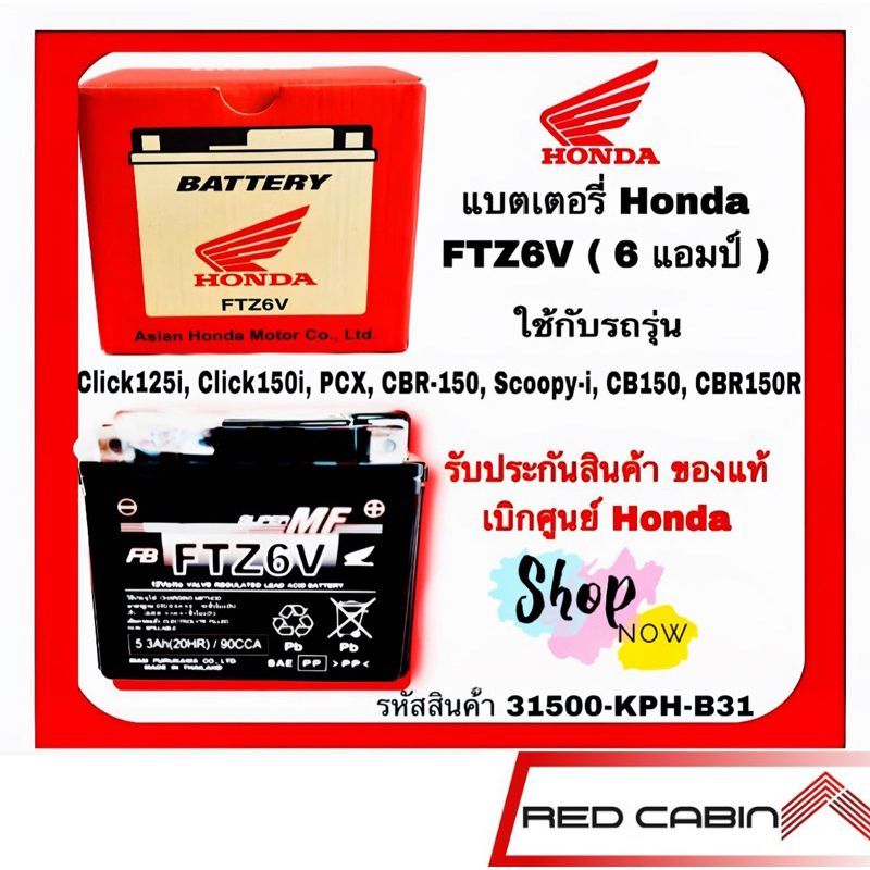 แบตเตอรี่ HONDA FTZ6V (6แอมป์) แบตแห้งของแท้ 100%ศูนย์ฮอนด้า CBR PCX125 Click125 scoopyi 2017ขึ้นไป