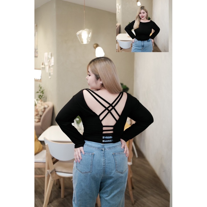 𝗗𝗮𝗿𝗸𝗹𝘆 𝗧𝗼𝗽 เสื้อแขนยาว ครอปสายหลัง ❤️สาวอวบ❤️ ผ้าสเปนเด็กซ์ มีส่งด่วน