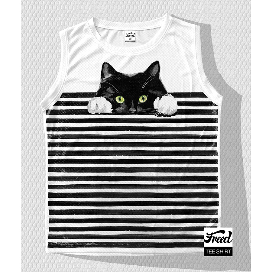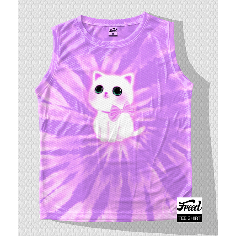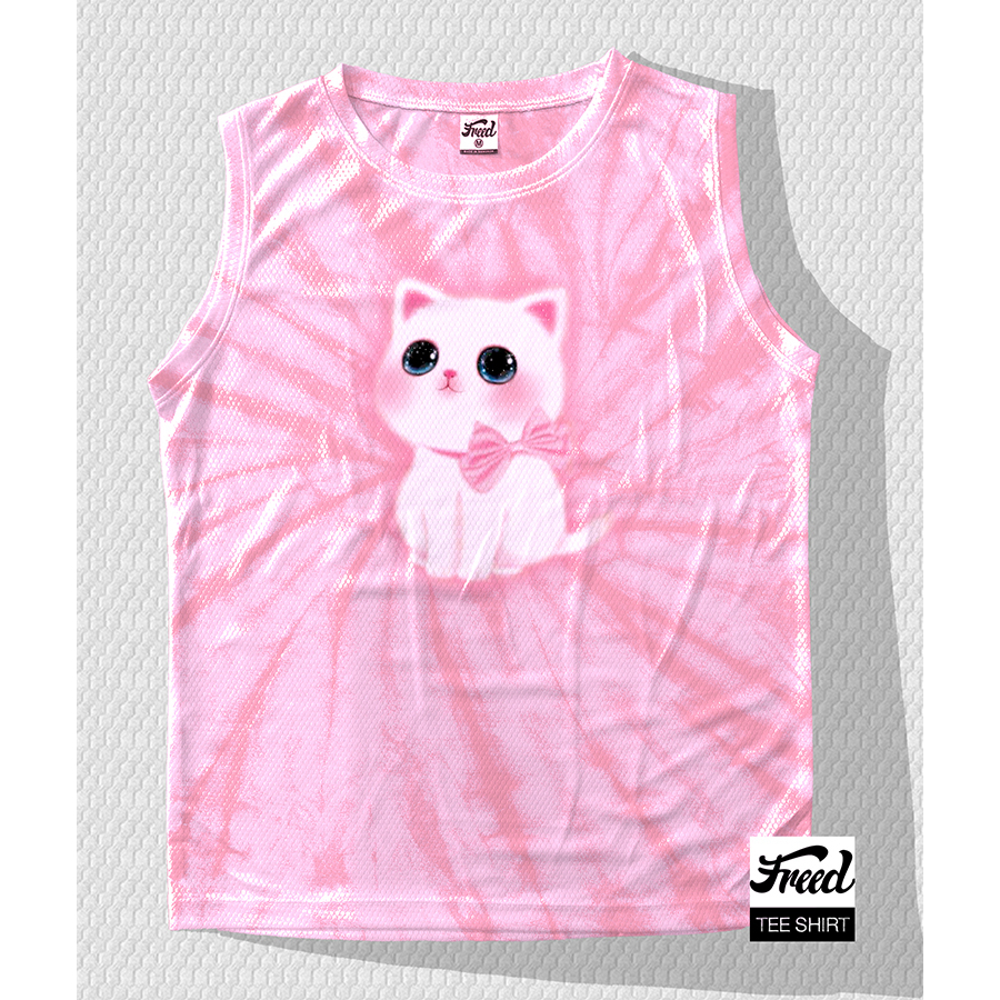เสื้อแขนกุด สีขาว ผ้าโมโครทอลายรั้งผึ้ง ลายแมวน่ารัก พร้อมส่ง มีไซร้s,m,l,xlเสื้อผู้ใหญ่