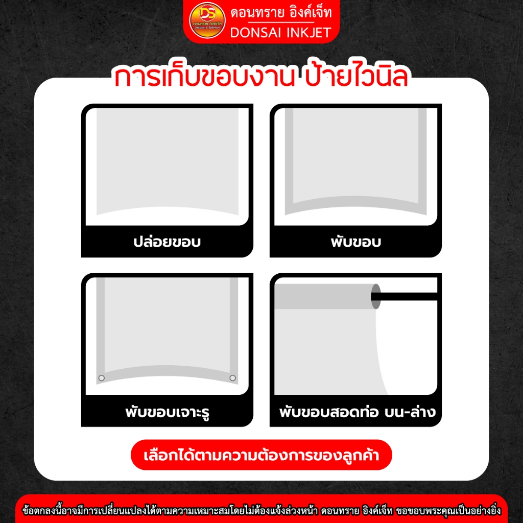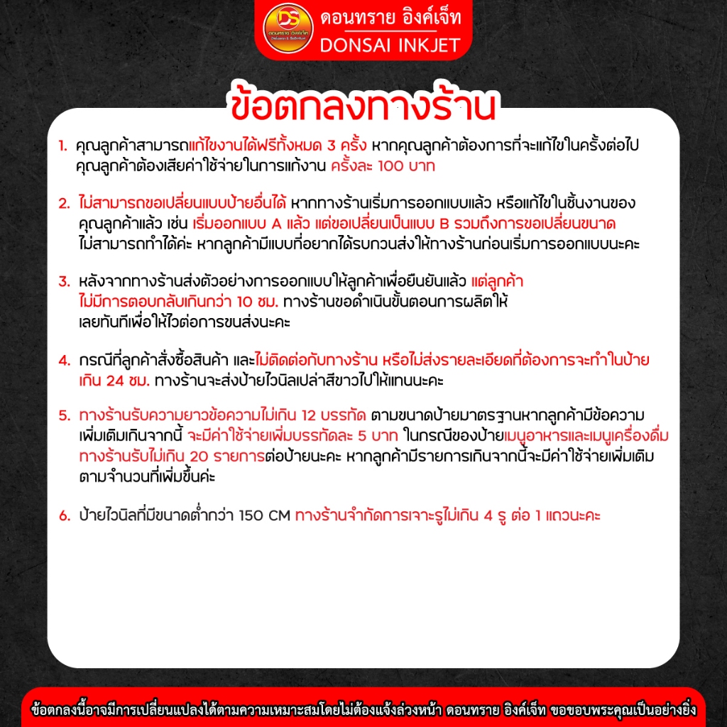 * ทักแชทก่อนสั่งซื้อนะคะ * ป้ายไวนิล ออกแบบฟรี พร้อมใช้งาน ราคาถูก มีหลายขนาดให้เลือก ส่งไว DONSAIINKJET